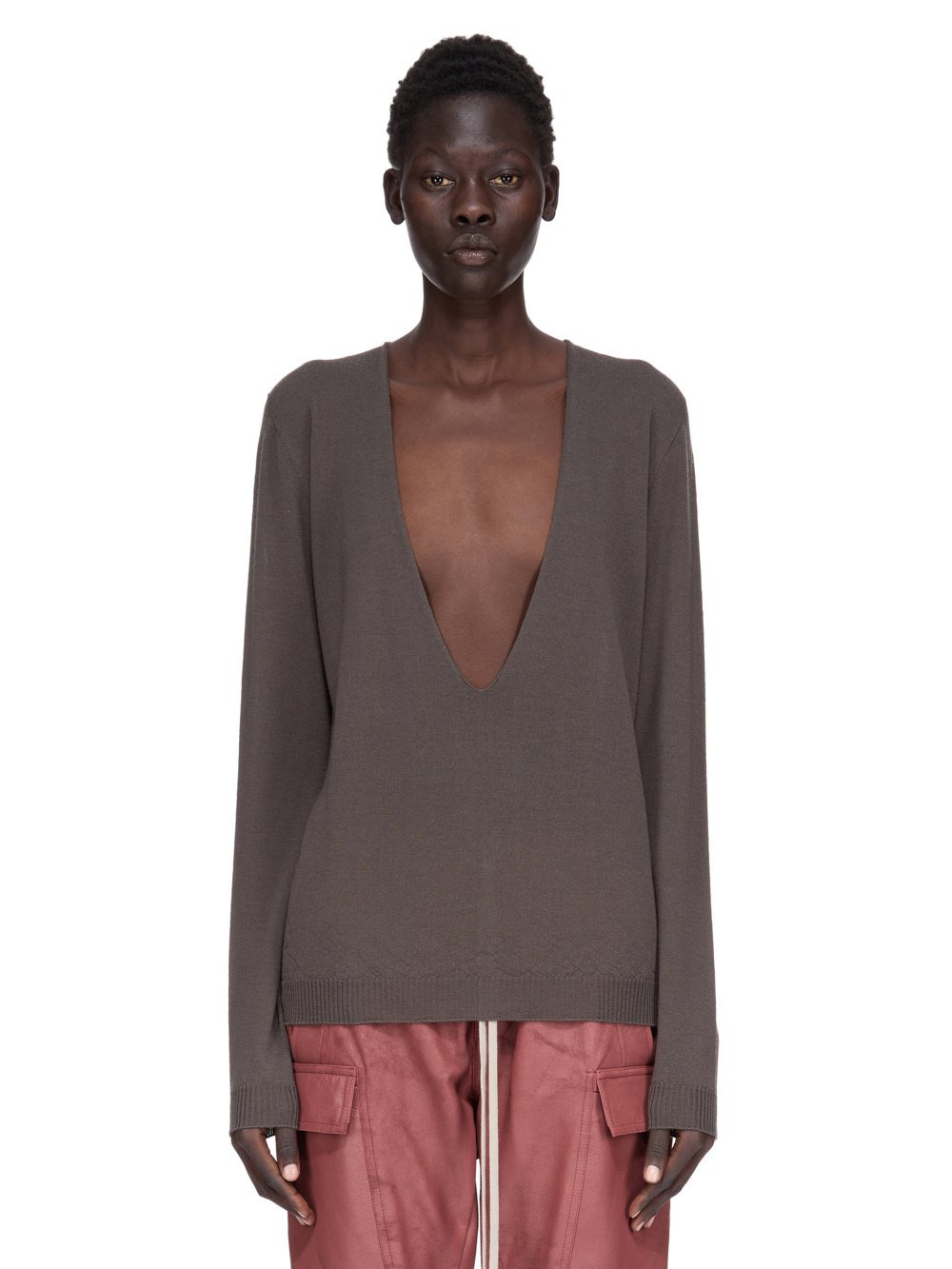 RICK OWENS FW25 CONCORDIANS EXTREME V NECK PULL IN DARK DUST LIGHTWEIGHT RASATO KNIT THIS EXTREME V NECK PULL IS BELOW HIP LENGTH WITH LONG SLEEVES. IT HAS AN EXTREME DEEP V NECK WITH SLIM KNIT EDGE AND RIBBED HEM AND CUFFS. IT FEATURES A SIGNATURE KNIT LINE RUNNING DOWN THE CENTRE BACK SPINE THIS LIGHTWEIGHT AND CLASSIC STITCH WOOL KNIT HAS A SOFT HANDFEEL COLOR: DARK DUST MATERIAL: 100% NEW WOOL MODEL IS 181CM TALL MODEL WEARS SIZE S