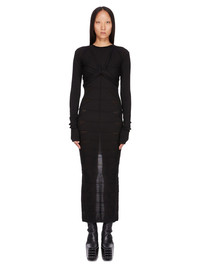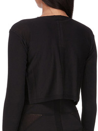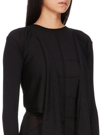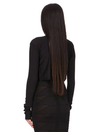 RICK OWENS FW25 CONCORDIANS CROP WRAP IN BLACK LIGHTWEIGHT RASATO KNIT THIS CROP WRAP IS BELOW BUST LENGTH WITH LONG SLIM SLEEVES. IT HAS A V NECK THAT DESCENDS TO LONG TIES THAT ARE DESIGNED TO TWIST, AND WRAP AROUND THE BODY, TYING AT THE BACK THIS LIGHTWEIGHT AND CLASSIC STITCH WOOL KNIT HAS A SOFT HANDFEEL COLOR: BLACK MATERIAL: 100% NEW WOOL MODEL IS 181CM TALL MODEL WEARS SIZE S