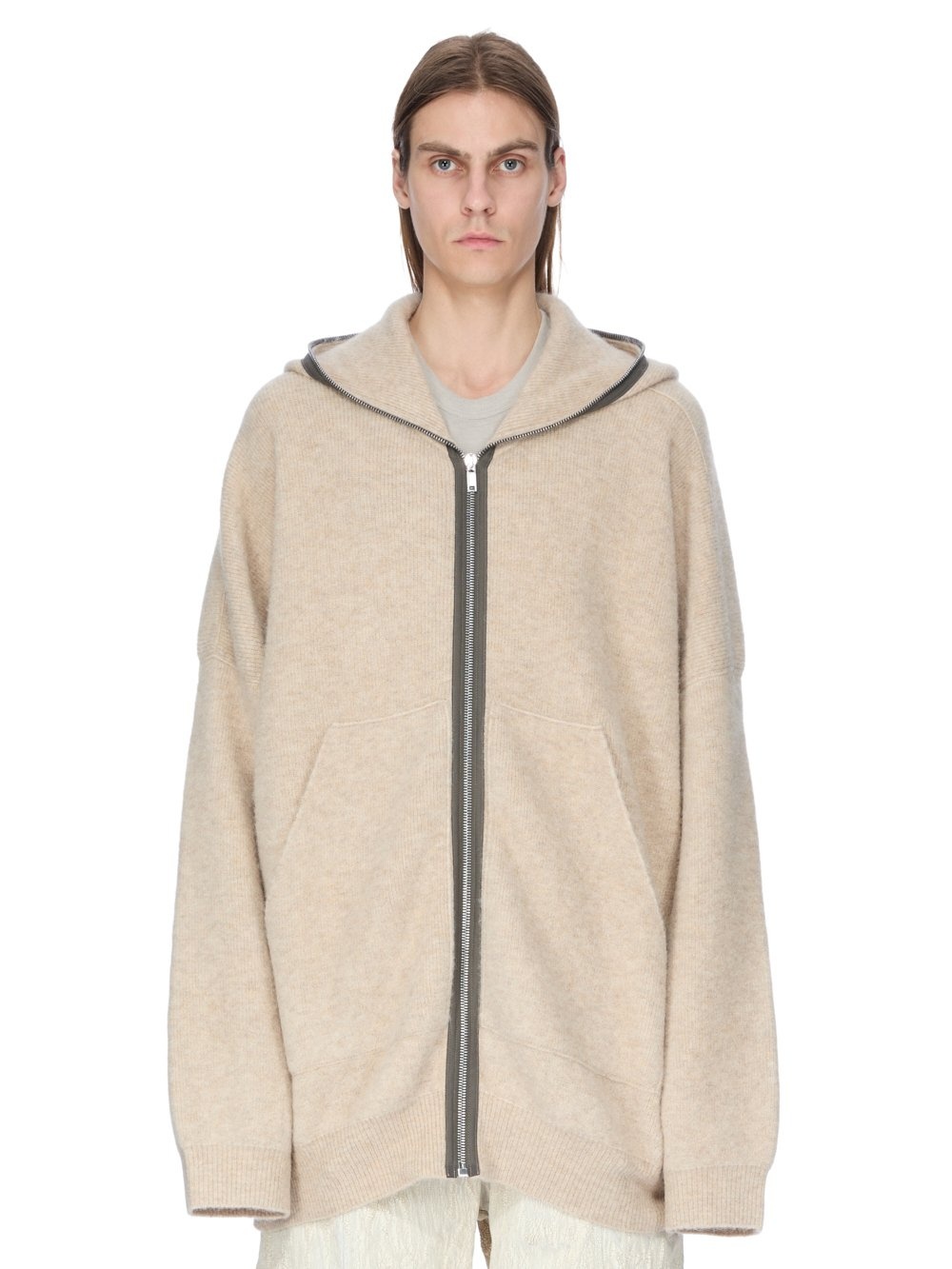 RICK OWENS FW25 CONCORDIANS GIMP HOODIE OVERSIZE IN DNA DUST ALPACA KNIT THIS GIMP HOODIE IS MID THIGH LENGTH WITH AN OVERSIZE FIT. IT HAS LONG SLEEVES WITH LOW SHOULDERS AND A DROPPED ARMHOLE, A LARGE HOOD AND TWO FRONT PATCH POCKETS. IT FEATURES IT HAS A FRONT ZIPPER CLOSURE THAT RUNS FROM THE HEM ALL THE WAY UP THROUGH THE HOOD, ALLOWING IT TO BE ZIPPED COMPLETELY CLOSED OVER THE FACE THIS A DENSE BUT LIGHT KNIT WITH A SOFT SLIGHTLY FLUFFY HAND COLOR: DNA DUST MATERIAL: 48% ALPACA + 30% NYLON + 20% WOOL + 2% ELASTANE MODEL IS 189CM TALL MODEL WEARS SIZE L