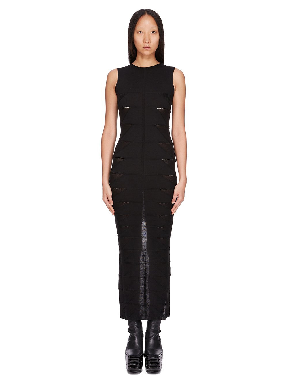 RICK OWENS FW25 CONCORDIANS TANK DRESS MOTIVO IN BLACK LIGHTWEIGHT RASATO KNIT THIS TANK DRESS MOTIVO IS ANKLE LENGTH. IT HAS A ROUND NECK WITH NARROW ROLLED EDGE, AND TANK SHOULDER. IT HAS KNIT PARALLEL LINES RUNNING HORIZONTALLY ACROSS THE TORSO AND SKIRT, FINISHING IN A SEMI TRANSPARENT TRIANGULAR RIBBED MOTIVO AT THE SIDE BODY. IT FEATURES A SLIM LINE RUNNING DOWN THE CENTRE FRONT, AND SIGNATURE CHANNEL RUNNING DOWN THE CENTRE BACK SPINE THIS LIGHTWEIGHT AND CLASSIC STITCH WOOL KNIT HAS A SOFT HANDFEEL COLOR: BLACK MATERIAL: 100% NEW WOOL MODEL IS 181CM TALL MODEL WEARS SIZE S