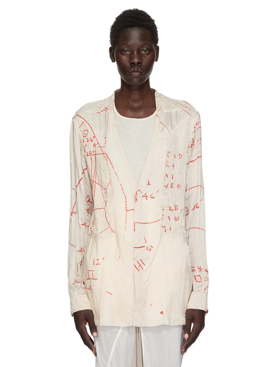 RICK OWENS SS26 TEMPLE LARRY FOGPOCKET SHIRT IN MILK/ORANGE PRINTED CUPRO TWILL THIS LARRY FOGPOCKET SHIRT IS HIP LENGTH AND HAS LONG SLEEVES WITH SNAP CUFFS. IT HAS A DEEP V NECK WITH CENTER FRONT OPENING WITH CONCEALED SNAP CLOSURES. IT FEATURES TWO FOG BREAST POCKETS WITH A VERTICAL OPENING AND INTERNAL SNAPS. IT HAS LEVEL SHOULDER SEAMS, A BACK YOKE AND A HEMLINE WITH BEVELED SIDES. THIS ITEM FEATURES AN EXACT COPY OF RICK OWENS’ ASTROLOGICAL NATAL CHART, HAND-DRAWN BY HIS FATHER JOHN ON THE DAY OF HIS BIRTH IN 1961. THIS LIGHTWEIGHT AND FLUID CUPRO TWILL HAS A GLOSSY SURFACE, A SOFT HANDFEEL AND WASHED FINISH. IT IS DIGITALLY PRINTED WITH OUR SEASONAL ASTRO MOTIF. THIS FABRIC IS MADE USING CERTIFIED CUPRO WHICH IS BIODEGRADABLE AND 100% PLANT BASED. AS IT’S MADE FROM COTTON WASTE, CUPRO HELPS FIND A PURPOSE TO FIBERS THAT WOULD OTHERWISE BE DISCARDED. COLOR: MILK/ORANGE MATERIAL:52% VISCOSE + 48% CUPRO YOKE AND POCKETS LINING 100% CUPRO MODEL IS 181CM TALL MODEL WEARS SIZE 40