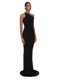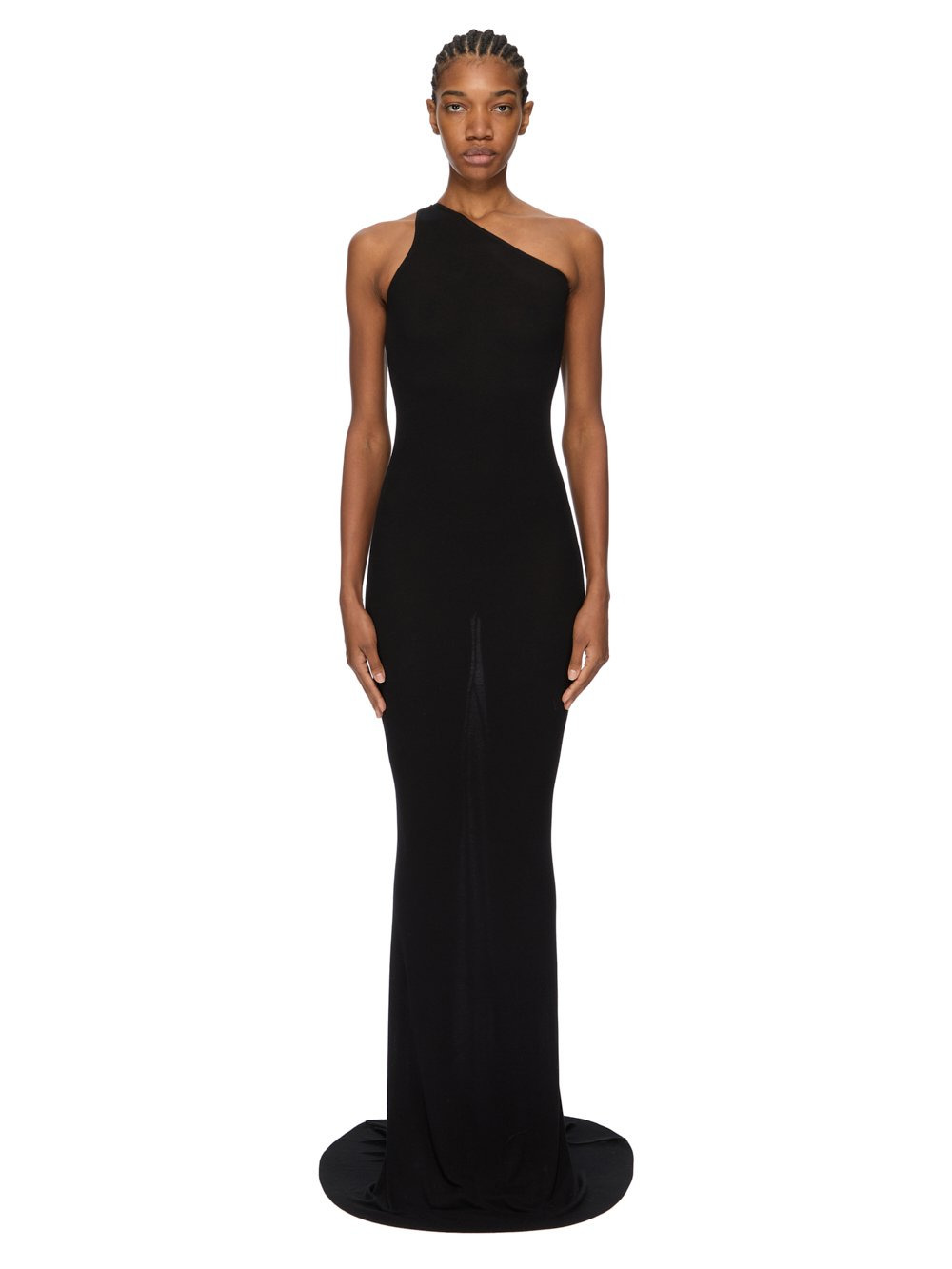 RICK OWENS FW25 CONCORDIANS ONE SHOULDER GOWN IN BLACK FLUID VISCOSE JERSEY THIS ONE SHOULDER GOWN IS FLOOR LENGTH WITH A RAW CUT HEM THAT POOLS OUT ON THE FLOOR AND HAS A BACK GODER. IT HAS A BIAS NECKLINE AND ONE SHOULDER STRAP AND A CLOSE TO THE BODY FIT. IT FEATURES THE SIGNATURE SINGLE SEAM RUNNING DOWN THE CENTRE BACK SPINE THIS MEDIUMWEIGHT AND FLUID VISCOSE JERSEY AND HAS A SOFT AND LIGHTLY BRUSHED HANDFEEL THIS JERSEY IS MADE FROM FSC® - CERTIFIED (FSC - C162846) VISCOSE WHICH ENSURES THAT THE FIBERS ARE PRODUCED FROM RESPONSIBLY MANAGED SOURCES AND NO DEFORESTATION OCCURS COLOR: BLACK MATERIAL: 100% VISCOSE MODEL IS 181CM TALL MODEL WEARS SIZE 40