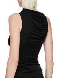 RICK OWENS FW25 CONCORDIANS SVITA GOWN IN BLACK SATIN VISCOSE JERSEY THIS SVITA GOWN IS FLOOR LENGTH AND SLEEVELESS. IT FEATURES A DRAPED NECKLINE THAT GATHERS ACROSS THE CHEST INTO THE RIGHT ARMHOLE AND HAS A BODY HUGGING FIT THAT GATHERS ACROSS THE BODY AND RUCHES INTO THE LEFT SIDE SEAM. IT THEN OPENS INTO A SPLIT FROM HIGH ON THE THIGH AND TAPERS SLIGHTLY TO THE HEM THIS MEDIUMWEIGHT AND FLUID VISCOSE JERSEY HAS A GLOSSY SURFACE AND A COLD AND SOFT HANDFEEL THIS JERSEY IS MADE FROM FSC® – C162846 CERTIFIED VISCOSE WHICH ENSURES THAT THE FIBERS ARE PRODUCED FROM RESPONSIBLY MANAGED SOURCES AND NO DEFORESTATION OCCURS COLOR: BLACK MATERIAL: 100% VISCOSE MODEL IS 181CM TALL MODEL WEARS SIZE 40