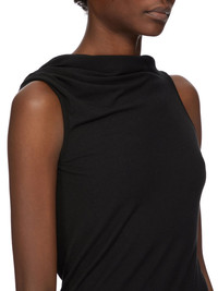 RICK OWENS LILIES FW25 CONCORDIANS EVA MINI IN BLACK CASHMERE BLEND JERSEY THIS EVA MINI IS MID-THIGH LENGTH AND SLEEVELESS. IT HAS A SLIGHTLY DRAPED BOAT NECK, WHICH FALLS INTO AN OPEN BACK, WITH A TWIST IN THE SMALL OF THE RIGHT HIP, AND A BODY SKIMMING FIT THIS MEDIUMWEIGHT AND FLUID MODAL AND CASHMERE BLEND JERSEY HAVE A SOFT AND WARM HANDFEEL COLOR: BLACK MATERIAL: 85% MODAL 9% CASHMERE 6% ELASTANE MODEL IS 181CM TALL MODEL WEARS SIZE 40