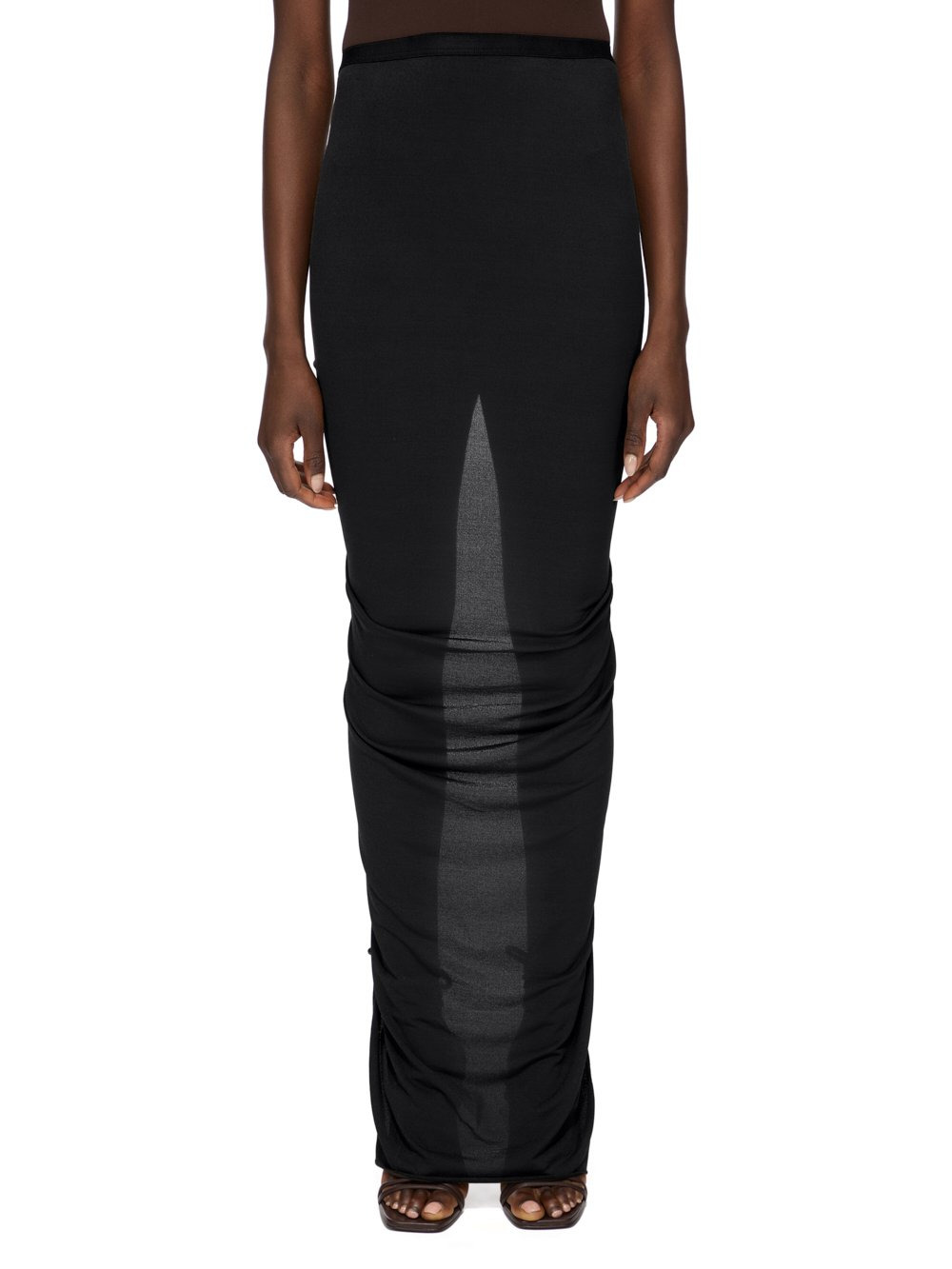 RICK OWENS LILIES FW25 CONCORDIANS EVA SKIRT IN BLACK VISCOSE CREPE JERSEY THIS EVA SKIRT IS FLOOR LENGTH AT FRONT WITH AN ELASTICIZED WAISTBAND. IT FEATURES A CENTER BACK SLIT TO ABOVE KNEE HEIGHT AND RUCHING ON ALONG THE BACK, OFF-CENTER, SEAM. IT HAS A BODY SKIMMING FIT THIS LIGHTWEIGHT AND FLUID VISCOSE CREPE JERSEY IS STRETCHY AND HAS A MATTE CREPE FACE SIDE AND A SOFT BACKSIDE THIS JERSEY IS MADE FROM C162846 CERTIFIED VISCOSE WHICH ENSURES THAT THE FIBERS ARE PRODUCED FROM RESPONSIBLY MANAGED SOURCES AND NO DEFORESTATION OCCURS COLOR: BLACK MATERIAL: 78% VISCOSE 17% POLYAMIDE 5% ELASTANE MODEL IS 181CM TALL MODEL WEARS SIZE 40