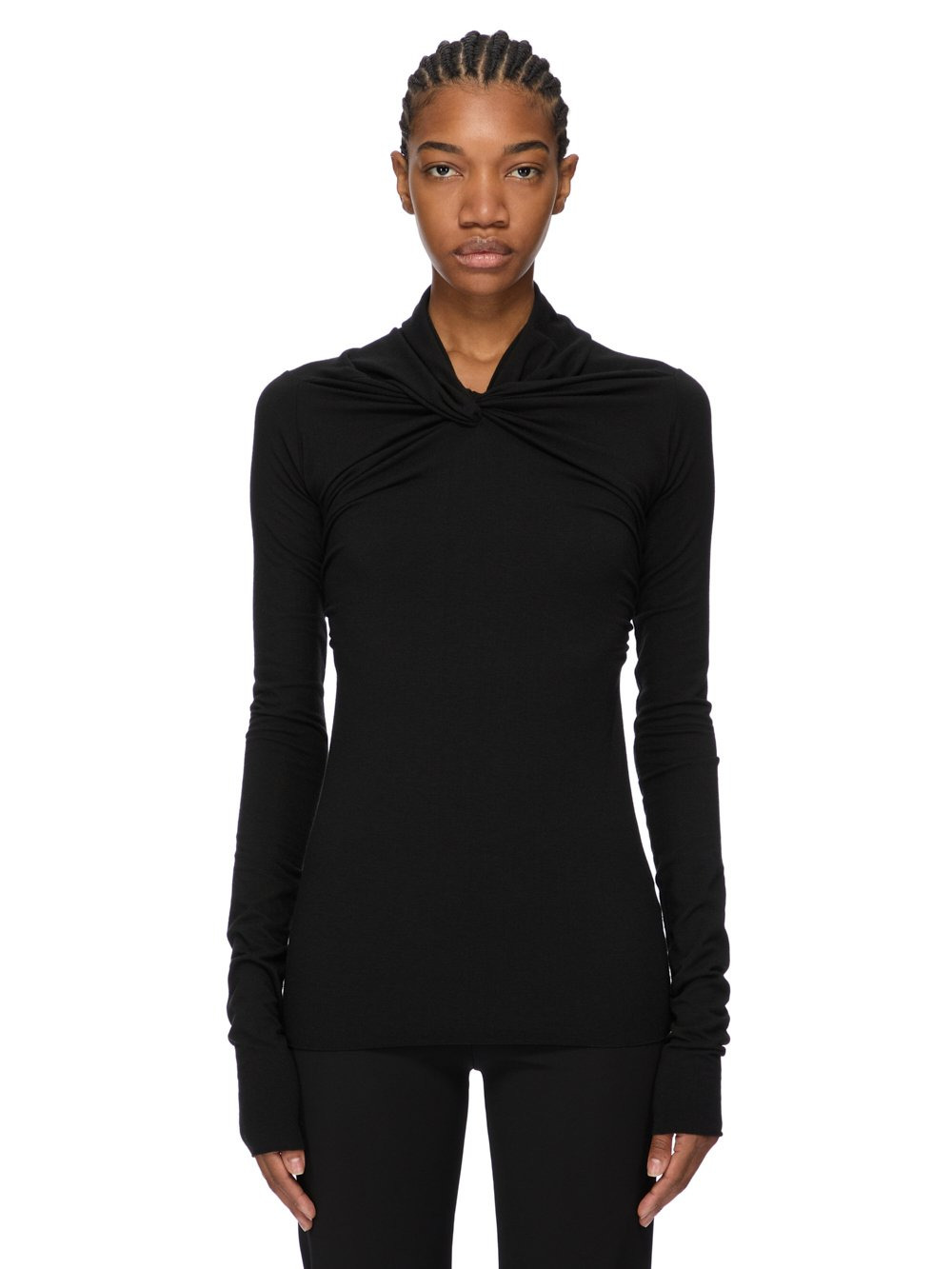 RICK OWENS FW25 CONCORDIANS KAIRO LS TOP IN BLACK CASHMERE BLEND JERSEY THIS KAIRO LS TOP IS BELOW HIP LENGTH WITH LONG SLIM SLEEVES AND A CLOSE TO THE BODY FIT. IT FEATURES A COWL NECK IN BACK WITH A FRONT TWIST AND DRAPINGS OVER UPPER CHEST AND SHOULDERS THIS MEDIUMWEIGHT AND FLUID MODAL AND CASHMERE BLEND JERSEY HAVE A SOFT AND WARM HANDFEEL COLOR: BLACK MATERIAL: 85% MODAL 9% CASHMERE 6% ELASTANE MODEL IS 181CM TALL MODEL WEARS SIZE 40