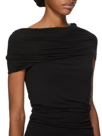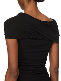 RICK OWENS FW25 CONCORDIANS LOLA TOP IN BLACK CASHMERE BLEND JERSEY THIS LOLA TOP IS ABOVE WAIST LENGTH. IT HAS A DRAPED TOP THAT CAN BE WORN MULTIPLE WAYS: TWISTED, EITHER TO EXPOSE OR CONCEAL THE SHOULDERS. IT HAS A CROSS-TWISTED HEM THIS MEDIUMWEIGHT AND FLUID MODAL AND CASHMERE BLEND JERSEY HAVE A SOFT AND WARM HANDFEEL COLOR: BLACK MATERIAL: 85% MODAL + 9% CASHMERE + 6% ELASTANE MODEL IS 181CM TALL MODEL WEARS SIZE 40