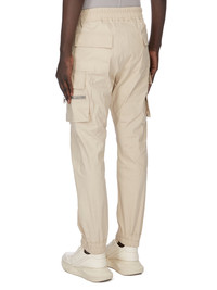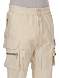 RICK OWENS SS26 TEMPLE MASTODON CARGO IN SAND HEAVY POPLIN THESE MASTODON CARGO PANTS ARE FULL LENGTH, WITH A SLIM FIT, AND AN ELASTICIZED WAIST WITH DRAWSTRING. THEY FEATURE TWO SIDE POCKETS, PLUS TWO ZIPPERED CARGO PANNIER POCKETS WITH FLAPS AND TABS ON THE OUTER THIGH. THEY HAVE TWO BACK POCKETS WITH FLAPS AND ELASTICIZED ANKLES. THIS MEDIUMWEIGHT COTTON POPLIN HAS A CRISP HANDFEEL AND WASHED FINISH. THIS FABRIC IS MADE USING GOTS CERTIFIED ORGANIC COTTON WHICH MEANS THE NATURAL FIBRE IS GROWN WITHOUT HARMFUL CHEMICALS, LEAVING OUR SOIL, AIR AND WATER CLEANER FROM CONTAMINATES. COLOR: SAND MATERIAL:97% COTTON + 3% ELASTANE MODEL IS 189CM TALL MODEL WEARS SIZE 48