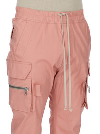 RICK OWENS SS26 TEMPLE MASTODON CARGO IN CORAL HEAVY POPLIN THESE MASTODON CARGO PANTS ARE FULL LENGTH, WITH A SLIM FIT, AND AN ELASTICIZED WAIST WITH DRAWSTRING. THEY FEATURE TWO SIDE POCKETS, PLUS TWO ZIPPERED CARGO PANNIER POCKETS WITH FLAPS AND TABS ON THE OUTER THIGH. THEY HAVE TWO BACK POCKETS WITH FLAPS AND ELASTICIZED ANKLES. THIS MEDIUMWEIGHT COTTON POPLIN HAS A CRISP HANDFEEL AND WASHED FINISH. THIS FABRIC IS MADE USING GOTS CERTIFIED ORGANIC COTTON WHICH MEANS THE NATURAL FIBRE IS GROWN WITHOUT HARMFUL CHEMICALS, LEAVING OUR SOIL, AIR AND WATER CLEANER FROM CONTAMINATES. COLOR: CORAL MATERIAL:97% COTTON + 3% ELASTANE MODEL IS 189CM TALL MODEL WEARS SIZE 48