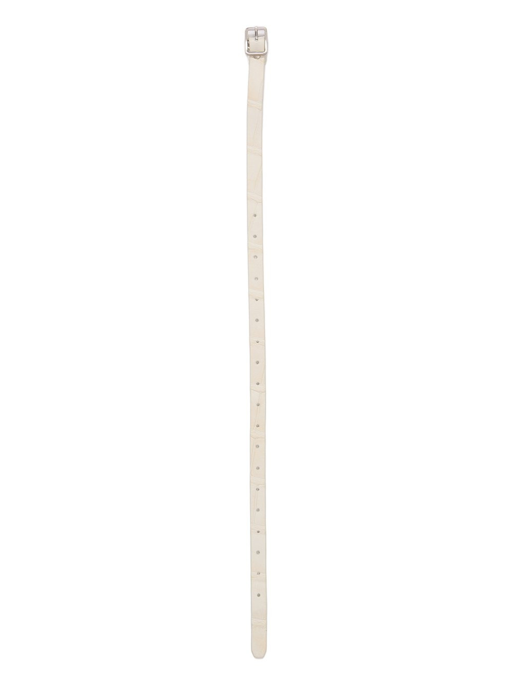 RICK OWENS FW25 CONCORDIANS RUNWAY CHOKER IN MILK ALBINO ALLIGATOR THIS CHOKER IS MADE FROM A STRAP OF ALLIGATOR LEATHER. IT IS ADJUSTABLE WITH NINETEEN HOLES AND A SMALL BUCKLE AT ONE END. IT IS EMBOSSED WITH THE RICK OWENS LOGO THIS GENUINE ALLIGATOR LEATHER IS SOFT WITH A WAXY HANDFEEL SCALE TEXTURE, COLOR AND PATTERN AS WELL AS MARKINGS AND SCRATCHES ARE NATURAL TO THE ANIMAL, THEY ARE SIGNS OF A LONG LIFE IN THE WILD AND WHAT MAKES EACH PIECE UNIQUE ALLIGATOR IS PROTECTED BY THE CITIES AGREEMENT AND REGULATIONS, WHICH MEANS EACH SKIN CAN BE TRACED BACK TO ITS ORIGIN COLOR: MILK MATERIAL: 100% ALLIGATOR LEATHER LINING 100% LAMB LEATHER DETAILS 100% ZAMA THIS ITEM IS AVAILABLE IN ONE SIZE
