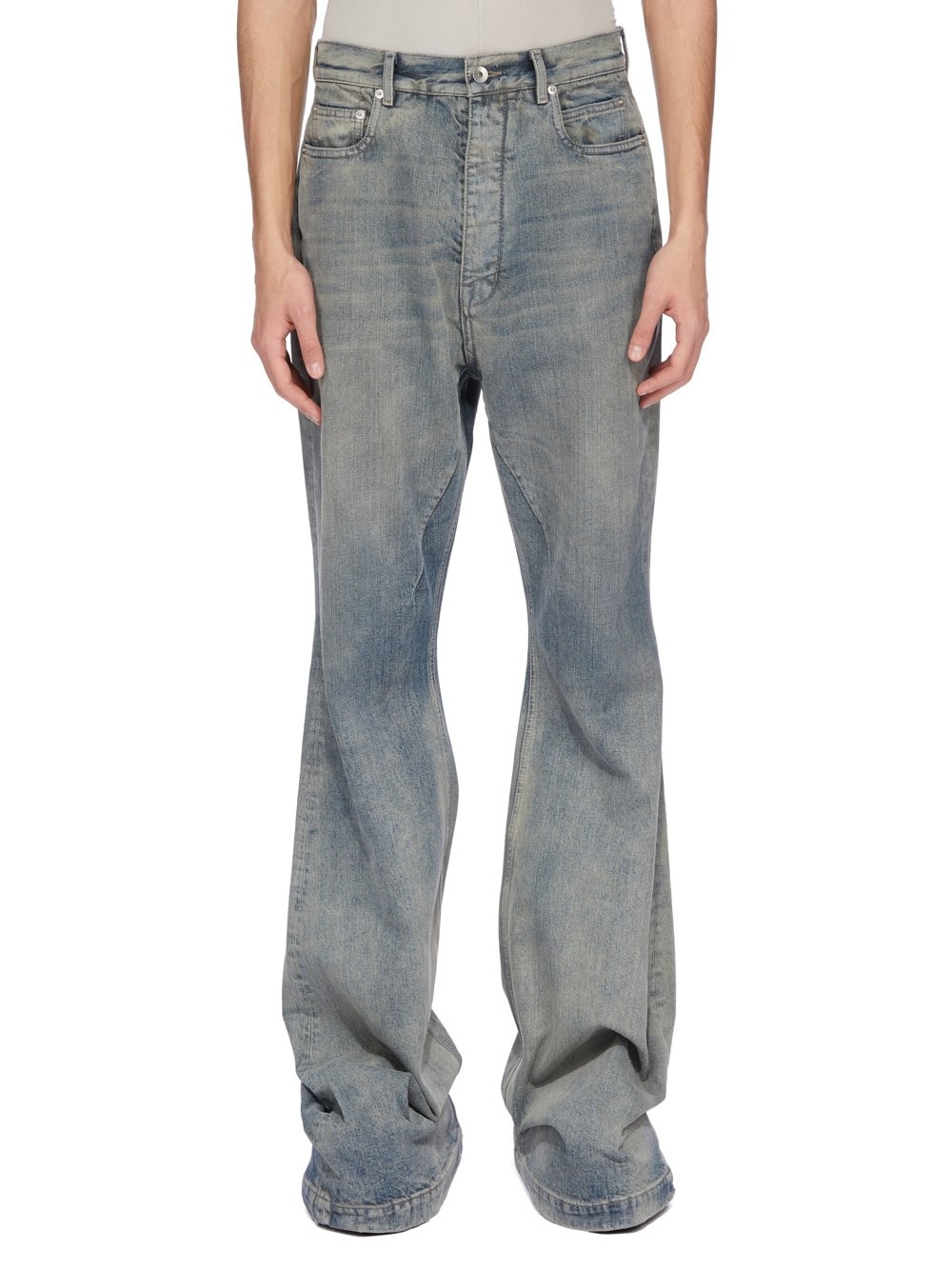 RICK OWENS FW25 CONCORDIANS RUNWAY BOLANS IN DIRTY HUSTLER 14OZ HUSTLER SLUB DENIM THESE BOLANS ARE A HIGH WAISTED, SLIM FIT 6-POCKET JEAN WITH A FLOOR-LENGTH BOOT CUT. THEY CLOSE WITH A WAIST BUTTON AND CONCEALED BUTTON FLY. THEY HAVE A WAISTBAND WITH BELT LOOPS AND POCKET RIVETS AND BACK PATCH POCKETS WITH TOPSTITCHING THIS MEDIUMWEIGHT HUSTLER DENIM IS MADE ON A 14OZ JAPANESE INDIGO AND NATURAL SLUB DENIM WOVEN IN FUKUYAMA PREFECTURE BY A MILL FOUNDED IN 1893. THE READY GARMENT IS STONE WASHED WITH MINERAL DYES TO ACHIEVE THE HUSTLER WASH THIS FABRIC IS MADE USING GOTS CERTIFIED ORGANIC COTTON WHICH MEANS THE NATURAL FIBER IS GROWN WITHOUT HARMFUL CHEMICALS, LEAVING OUR SOIL, AIR AND WATER CLEANER FROM CONTAMINATES THIS GARMENT IS TREATED IN AN ITALIAN WASH HOUSE BASED IN THE VENETO AREA OF ITALY, THAT PRODUCES IN SMALLER TREATMENT BATHS TO REDUCE WATER WASTE AND UTILIZE A WATER PURIFYING PROCESS THAT ENABLES THEM TO RECYCLE A PORTION OF THE WATER USED. ALL OF OUR DENIM WASHES ARE ZDHC CERTIFIED COLOR: DIRTY HUSTLER MATERIAL: 100% COTTON POCKETS LINING 52% POLYESTER + 48% COTTON MODEL IS 189CM TALL MODEL WEARS SIZE 31