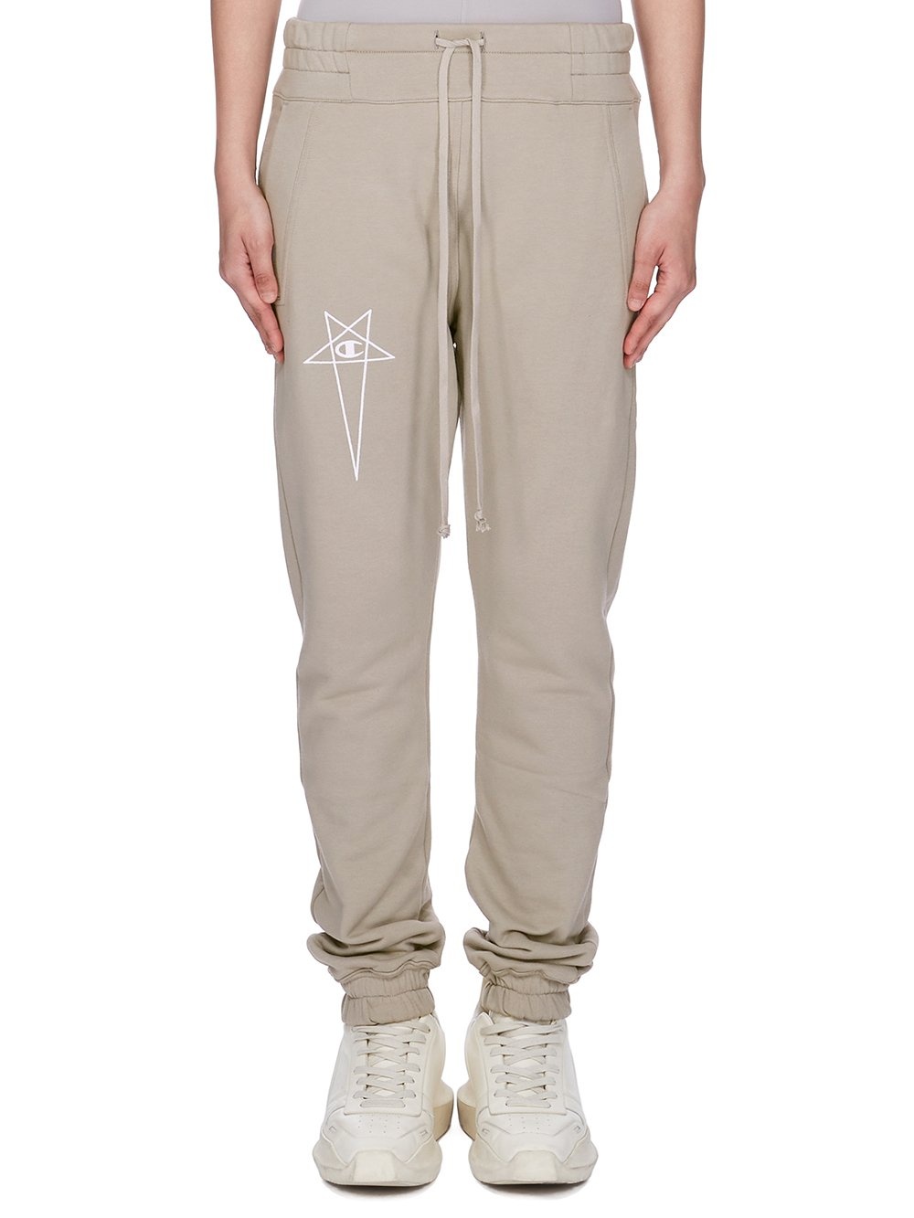 CHAMPION X RICK OWENS SS25 JOGGERS IN PEARL COMPACT FELPA JERSEY THEY HAVE A 3D EMBROIDERED SIGNATURE CHAMPION X RICK OWENS PENTAGRAM LOGO ACROSS FRONT AND A CHAMPION LOGO ON THE BACK HIP THIS HEAVYWEIGHT JERSEY IS COMPACT WITH A DRY HANDFEEL THIS JERSEY IS MADE USING CERTIFIED ORGANIC COTTON WHICH MEANS THE NATURAL FIBER IS GROWN WITHOUT HARMFUL CHEMICALS, LEAVING OUR SOIL, AIR AND WATER CLEANER FROM CONTAMINATES COLOR: PEARLMATERIAL: 100% COTTON MODEL WEARS SIZE M MODEL IS 181CM TALL