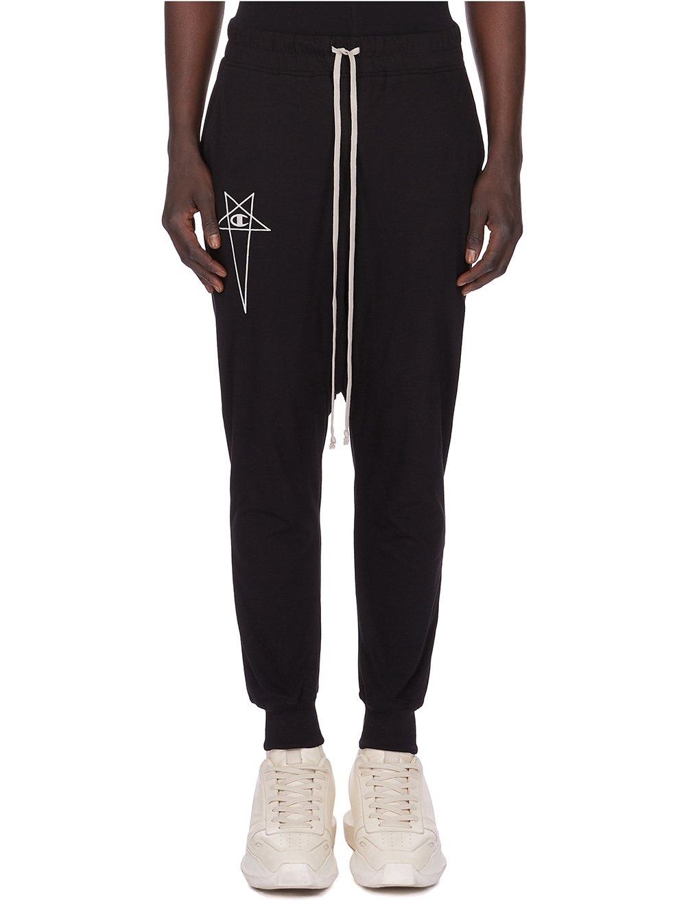 CHAMPION X RICK OWENS SS25 PRISONER DRAWSTRING IN BLACK COTTON JERSEY THEY HAVE A 3D EMBROIDERED SIGNATURE CHAMPION X RICK OWENS PENTAGRAM LOGO ACROSS FRONT AND A CHAMPION LOGO ON THE BACK HIP THIS MEDIUMWEIGHT CLASSIC COTTON JERSEY IS COMPACT WITH A DRY HANDFEEL THIS JERSEY IS MADE USING CERTIFIED ORGANIC COTTON WHICH MEANS THE NATURAL FIBER IS GROWN WITHOUT HARMFUL CHEMICALS, LEAVING OUR SOIL, AIR AND WATER CLEANER FROM CONTAMINATES COLOR: BLACKMATERIAL: 100% COTTON INSERTS 95% COTTON + 5% ELASTANE MODEL WEARS SIZE M MODEL IS 189CM TALL