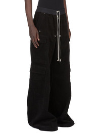 RICK OWENS FW25 CONCORDIANS CARGOBELAS IN BLACK LINEN CORDUROY THESE CARGOBELAS PANTS ARE FULL-LENGTH WITH A LOW CROTCH AND WIDE LEG. THEY FEATURE AN ELASTICIZED WAISTBAND WITH DRAWSTRING AND A BELA EXPOSED CENTER ZIPPER WITH TWO SNAP DETAIL AT BOTTOM. THEY HAVE SIDE WELT POCKETS WITH RIVET AND EYELET DETAIL, FOUR BEVELED CARGO POCKETS ON THE SIDE LEG AND TWO REAR WELT POCKETS WITH CONCEALED SNAPS AND TOPSTITCHING THIS MEDIUMWEIGHT COTTON AND LINEN BLEND CORDUROY HAS A SOFT HANDFEEL THIS FABRIC IS MADE USING GOTS CERTIFIED ORGANIC COTTON WHICH MEANS THE NATURAL FIBER IS GROWN WITHOUT HARMFUL CHEMICALS, LEAVING OUR SOIL, AIR AND WATER CLEANER FROM CONTAMINATES COLOR: BLACK MATERIAL: 74% COTTON + 26% LINEN BUTTONS 100% BUFFALO HORN MODEL IS 189CM TALL MODEL WEARS SIZE 48