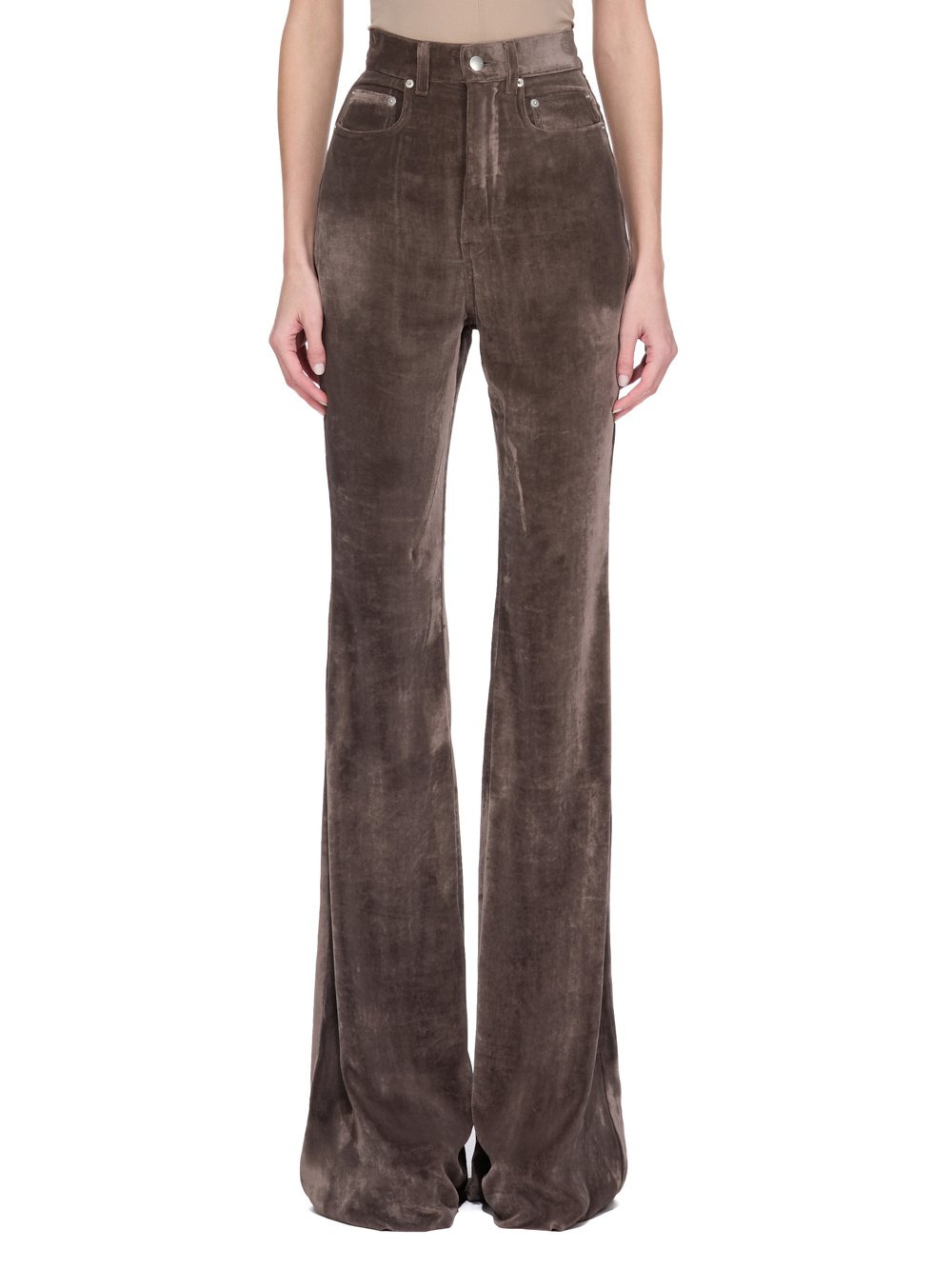 RICK OWENS FW25 CONCORDIANS BOLAN BOOTCUT IN DARKDUST VELVET THIS BOLAN BOOTCUT IS A HIGH WAISTED, SLIM FIT 6-POCKET JEAN WITH A FLOOR-LENGTH BOOT CUT. THEY CLOSE WITH A WAIST BUTTON AND CONCEALED BUTTON FLY. THEY HAVE A WAISTBAND WITH BELT LOOPS AND POCKET RIVETS AND BACK PATCH POCKETS WITH TOPSTITCHING THIS LIGHTWEIGHT AND FLUID VELVET HAS A SOFT AND WASHED UNEVEN FINISH. THIS FABRIC IS MADE FROM CERTIFIED VISCOSE WHICH ENSURES THAT THE FIBERS ARE PRODUCED FROM RESPONSIBLY MANAGED SOURCES AND NO DEFORESTATION OCCURS COLOR: DARKDUST MATERIAL: 82% VISCOSE + 18% SILK MODEL IS 181CM TALL MODEL WEARS SIZE 26