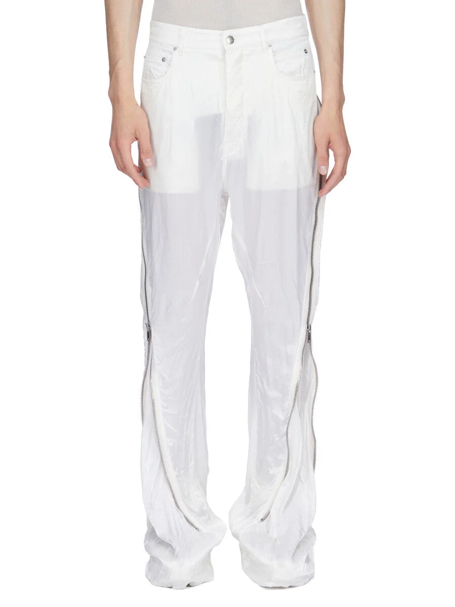 RICK OWENS SS26 TEMPLE BOLAN BANANA IN MILK CUPRO SATIN THIS BOLAN BANANA IS A HIGH WAISTED, SLIM FIT, 5 POCKET JEAN WITH A FLOOR-LENGTH BOOT CUT. THEY HAVE A CONCEALED BUTTON FLY AND A WAISTBAND WITH CENTER BUTTON, BELT LOOPS AND POCKET RIVETS AND BACK PATCH POCKETS WITH TOPSTITCHING. THEY FEATURE A LONG ZIPPER RUNNING FROM CENTER BUTT, CURVING AROUND THE HIP TO THE HEM. IT CAN UNZIP AT BACK TO EXPOSE THE BUTT, AND ALSO ZIP UP FROM THE HEM TO EXPOSE AN INNER FLARED PANEL IN THE LEG. THIS LIGHTWEIGHT AND FLUID CUPRO SATIN HAS A GLOSSY SURFACE, A SOFT HANDFEEL AND WASHED FINISH. THIS FABRIC IS MADE USING CUPRO WHICH IS BIODEGRADABLE AND 100% PLANT BASED. AS IT’S MADE FROM COTTON WASTE, CUPRO HELPS FIND A PURPOSE TO FIBERS THAT WOULD OTHERWISE BE DISCARDED. COLOR: MILK MATERIAL:100% CUPRO MODEL IS 189CM TALL MODEL WEARS SIZE 31