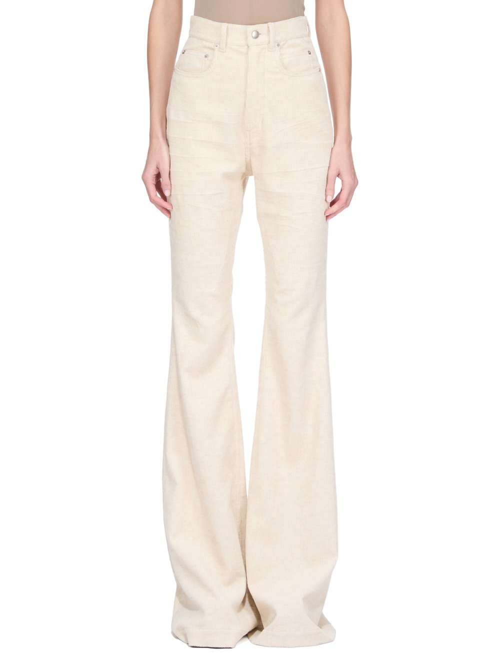 RICK OWENS FW25 CONCORDIANS BOLAN BOOTCUT IN NATURAL LINEN CORDUROY THIS BOLAN BOOTCUT IS A HIGH WAISTED, SLIM FIT 6-POCKET JEAN WITH A FLOOR-LENGTH BOOT CUT. THEY CLOSE WITH A WAIST BUTTON AND CONCEALED BUTTON FLY. THEY HAVE A WAISTBAND WITH BELT LOOPS AND POCKET RIVETS AND BACK PATCH POCKETS WITH TOPSTITCHING THIS MEDIUMWEIGHT COTTON AND LINEN BLEND CORDUROY HAS A SOFT HANDFEEL THE COLOR OF THIS CORDUROY IS NATURAL WITH SLUBS AND IMPURITIES VISIBLE AS A PART OF THE COLORATION THIS FABRIC IS MADE USING GOTS CERTIFIED ORGANIC COTTON WHICH MEANS THE NATURAL FIBER IS GROWN WITHOUT HARMFUL CHEMICALS, LEAVING OUR SOIL, AIR AND WATER CLEANER FROM CONTAMINATES COLOR: NATURAL MATERIAL: 74% COTTON + 26% LINEN MODEL IS 181CM TALL MODEL WEARS SIZE 26