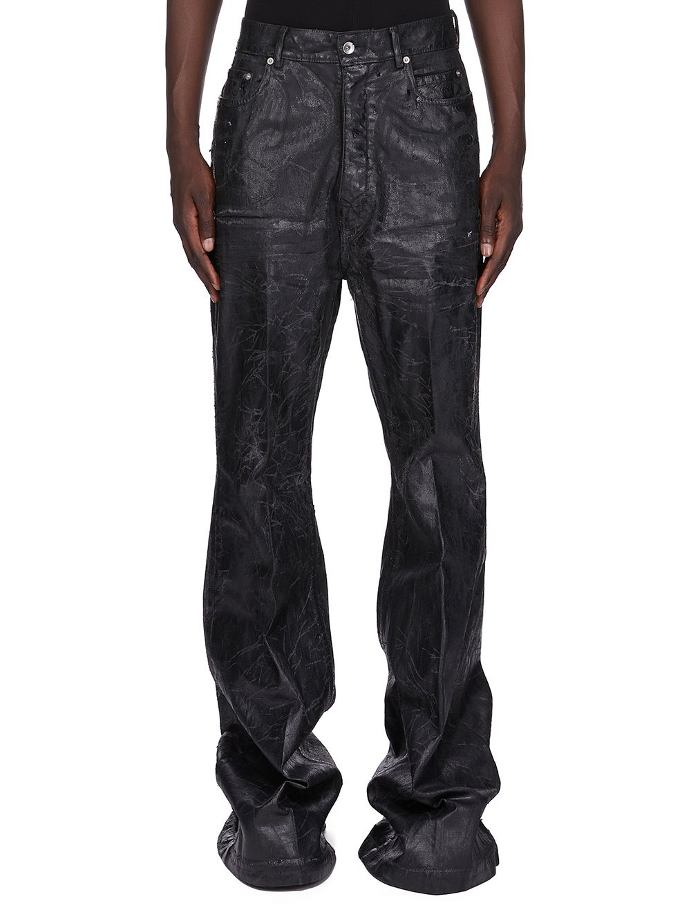 RICK OWENS FW25 CONCORDIANS RUNWAY BOLANS IN 13OZ BLACK MEGACRUST DENIM THESE BOLANS ARE A HIGH WAISTED, SLIM FIT 6-POCKET JEAN WITH A FLOOR-LENGTH BOOT CUT. THEY CLOSE WITH A WAIST BUTTON AND CONCEALED BUTTON FLY. THEY HAVE A WAISTBAND WITH BELT LOOPS AND POCKET RIVETS AND BACK PATCH POCKETS WITH TOPSTITCHING THIS MEDIUMWEIGHT MEGACRUST DENIM IS MADE ON A 13OZ BLACK AND NATURAL JAPANESE DENIM. THE READY GARMENT IS OVERDYED BLACK AND TREATED WITH A WAX FINISH, THEN SEVERAL LAYERS OF BLACK FOIL IS PRESSED ON TOP AND A FINAL WASH MAKES THE FOIL PEEL AND CRACK THE NATURAL ASPECTS OF THIS TREATMENT MEANS THE FOIL HAS PEELED OFF AND CRACKED IN CERTAIN AREAS AND WILL CONTINUE TO DO SO WITH WEAR AND ABRASION. THIS IS AN INHERENT CHARACTERISTIC OF THIS TYPE OF TREATMENT AND IS A DESIRED A VISUAL ASPECT WHICH ADDS TO THE UNIQUENESS OF EACH PIECE THIS GARMENT IS TREATED IN AN ITALIAN WASH HOUSE BASED IN THE VENETO AREA OF ITALY, THAT PRODUCES IN SMALLER TREATMENT BATHS TO REDUCE WATER WASTE AND UTILIZE A WATER PURIFYING PROCESS THAT ENABLES THEM TO RECYCLE A PORTION OF THE WATER USED. ALL OF OUR DENIM WASHES ARE ZDHC CERTIFIED COLOR: BLACK MATERIAL: 100% COTTON POCKETS LINING 52% POLYESTER + 48% COTTON MODEL IS 189CM TALL MODEL WEARS SIZE 31