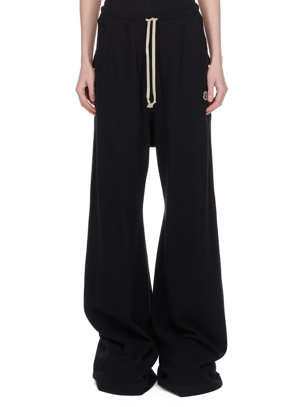 MONCLER + RICK OWENS FW24 WIDE BELA PANTS IN BLACK DOUBLE BRUSHED JERSEY THESE WIDE BELA PANTS ARE FULL-LENGTH WITH A LOW CROTCH AND A WIDE LEG. THEY FEATURE AN ELASTICIZED WAISTBAND WITH DRAWSTRING AND A BELA EXPOSED CENTRE ZIPPER WITH TWO SNAP DETAIL AT BOTTOM. THEY HAVE SIDE POCKETS WITH EYELET AND RIVET DETAIL AND BACK POCKETS WITH FLAPS. IT HAS THE MONCLER + RICK OWENS EMBROIDERED LOGO PATCH ON THE LEFT THIGH THIS MEDIUMWEIGHT COTTON JERSEY HAS A SOFT AND WARM HAND FEEL WITH A BRUSHED SURFACE. THIS JERSEY IS MADE USING CERTIFIED ORGANIC COTTON. - COLOR: BLACK - MATERIAL: 100% COTTON - MALE MODEL IS 189 CM TALL, FEMALE MODEL IS 181 CM TALL - MALE MODEL IS WEARING SIZE M, FEMALE MODEL IS WEARING SIZE XS
