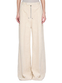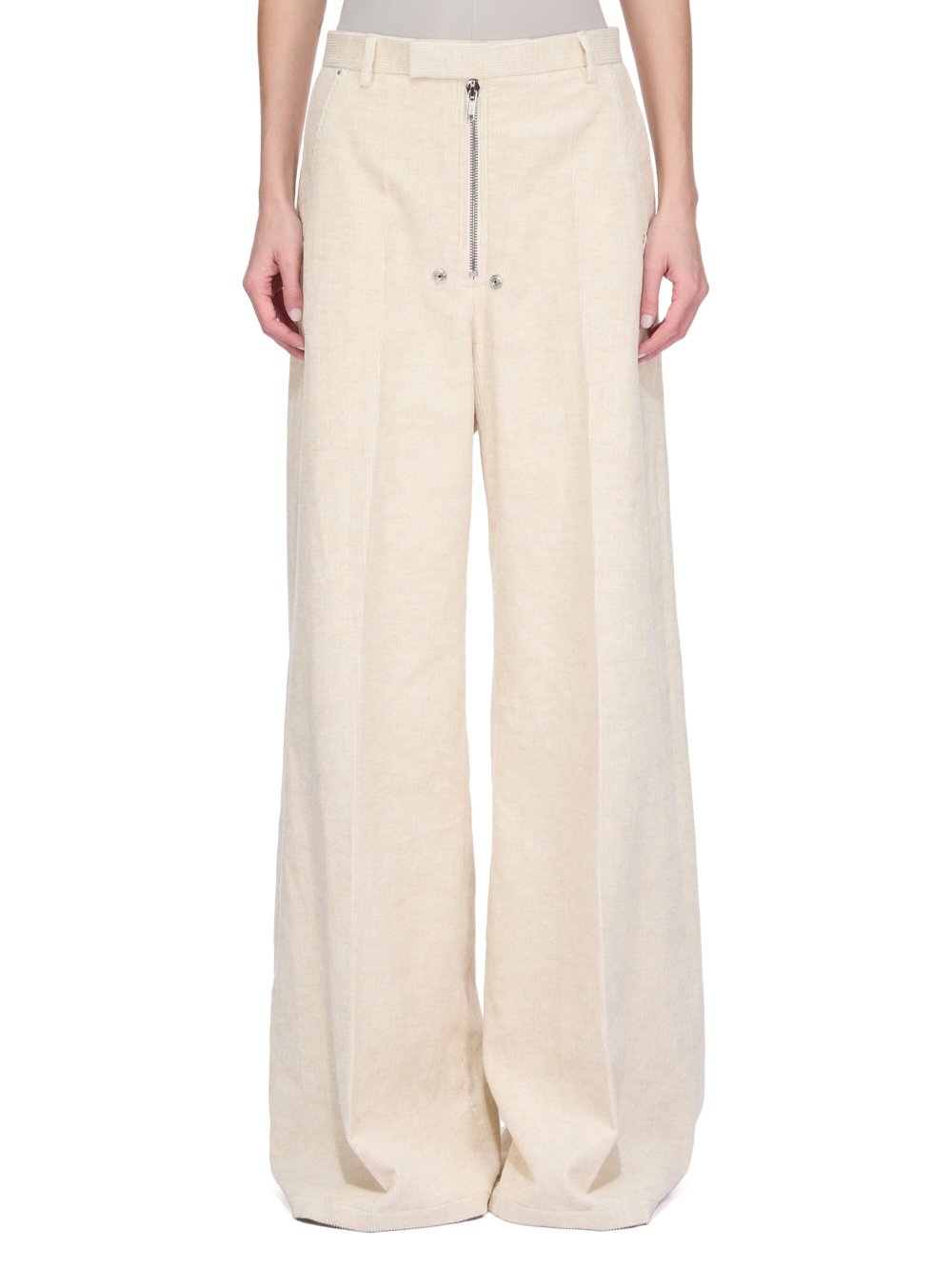 RICK OWENS FW25 CONCORDIANS ZIPFRONT HOODED JKT IN NATURAL LINEN CORDUROY THESE TAILORED WIDE BELAS ARE FULL-LENGTH WITH A LOW CROTCH AND WIDE LEG. THEY FEATURE A WAISTBAND WITH BELT LOOPS, BUTTON CLOSURE AND A BELA EXPOSED CENTER ZIPPER WITH TWO SNAP DETAIL AT BOTTOM. THEY HAVE SIDE WELT POCKETS WITH RIVET AND EYELET DETAIL AND TWO REAR WELT POCKETS WITH SNAPS AND TOPSTITCHING THIS MEDIUMWEIGHT COTTON AND LINEN BLEND CORDUROY HAS A SOFT HANDFEEL THE COLOR OF THIS CORDUROY IS NATURAL WITH SLUBS AND IMPURITIES VISIBLE AS A PART OF THE COLORATION THIS FABRIC IS MADE USING GOTS CERTIFIED ORGANIC COTTON WHICH MEANS THE NATURAL FIBER IS GROWN WITHOUT HARMFUL CHEMICALS, LEAVING OUR SOIL, AIR AND WATER CLEANER FROM CONTAMINATES COLOR: NATURAL MATERIAL: 74% COTTON + 26% LINEN BUTTONS 100% BUFFALO HORN MODEL IS 181CM TALL MODEL WEARS SIZE 40