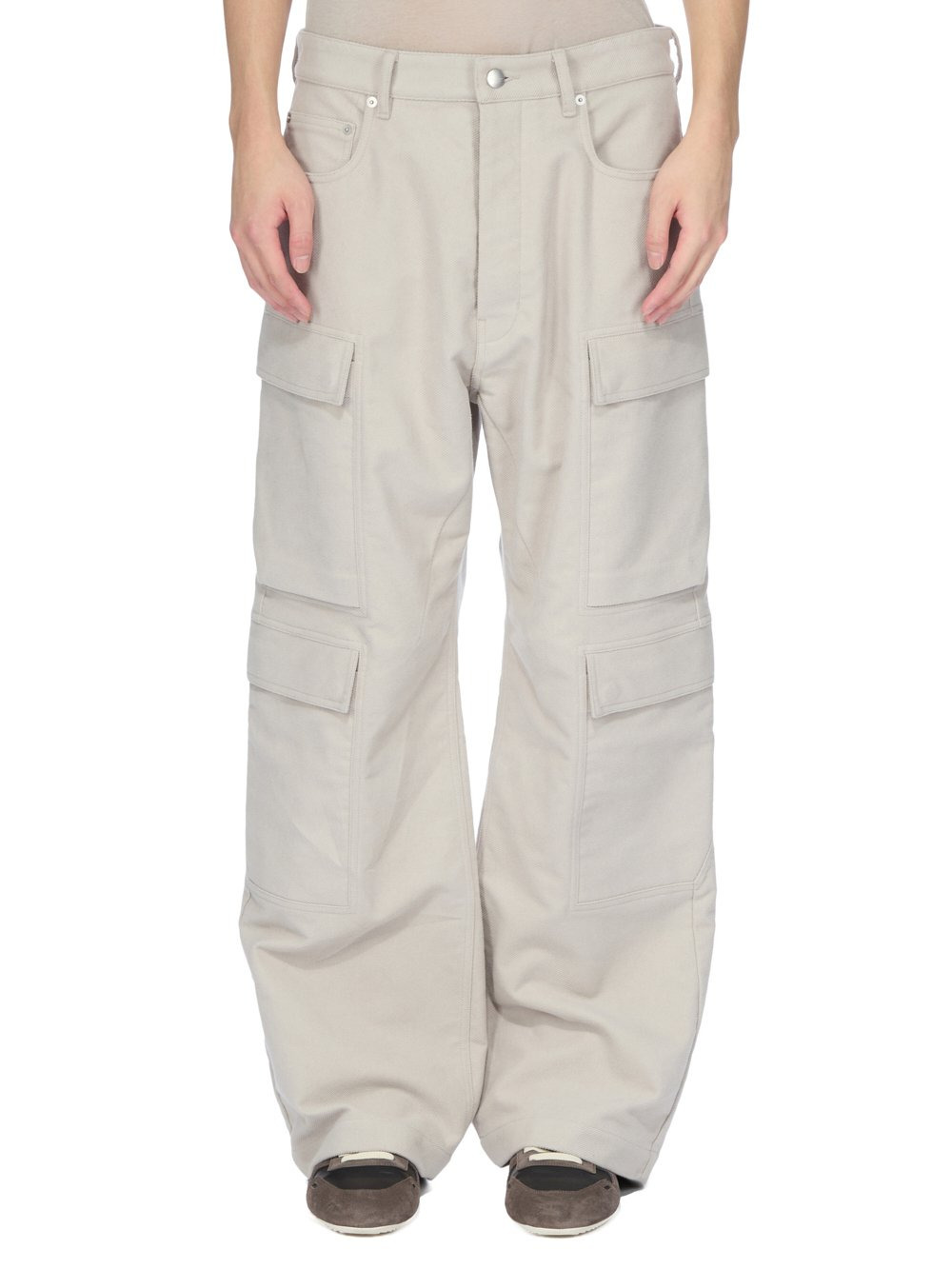 RICK OWENS FW25 CONCORDIANS DOUBLE CARGO JEANS IN PEARL BRUSHED HEAVY TWILL THESE DOUBLE CARGO JEANS ARE FULL LENGTH 5 POCKET JEAN WITH A LOW-RISE AND A LOOSE FIT. THEY HAVE A SILVER BUTTON FLY, BELT LOOPS AND POCKET RIVETS AND THEY FEATURE TWO BEVELED CARGO POCKETS ON THE THIGH, WITH TWO SQUARE CARGO POCKETS BELOW, AND TWO SQUARE BACK POCKETS, ALL HAVE FLAPS AND TOPSTITCHING THESE GETH JEANS ARE A FULL LENGTH 5 POCKET JEAN WITH A LOW-RISE AND WIDE FIT. THEY HAVE A SILVER BUTTON FLY, BELT LOOPS AND POCKET RIVETS THIS MEDIUMWEIGHT COTTON TWILL FABRIC HAS A SOFT BRUSHED HANDFEEL THIS FABRIC IS MADE USING GOTS CERTIFIED ORGANIC COTTON WHICH MEANS THE NATURAL FIBER IS GROWN WITHOUT HARMFUL CHEMICALS, LEAVING OUR SOIL, AIR AND WATER CLEANER FROM CONTAMINATES COLOR: PEARL MATERIAL: 100% COTTON MODEL IS 189CM TALL MODEL WEARS SIZE 31