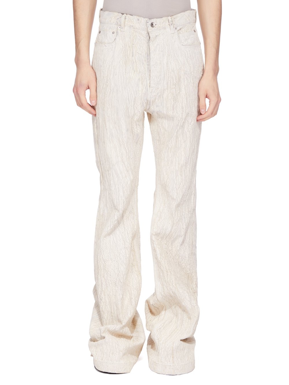 RICK OWENS FW25 CONCORDIANS RUNWAY BOLANS IN 13OZ MILK MEGACRUST DENIM THESE BOLANS ARE A HIGH WAISTED, SLIM FIT 6-POCKET JEAN WITH A FLOOR-LENGTH BOOT CUT. THEY CLOSE WITH A WAIST BUTTON AND CONCEALED BUTTON FLY. THEY HAVE A WAISTBAND WITH BELT LOOPS AND POCKET RIVETS AND BACK PATCH POCKETS WITH TOPSTITCHING THIS MEDIUMWEIGHT MILK MEGACRUST DENIM IS OVERDYED DUST AND THEN TREATED WITH LAYERS OF MILK COLORED FOIL THAT IS PRESSED ON BY HAND THE NATURAL ASPECTS OF THIS TREATMENT MEANS THE FOIL APPLICATION IS IRREGULAR AND HAS PEELED OFF AND CRACKED IN CERTAIN AREAS AND WILL CONTINUE TO DO SO WITH WEAR AND ABRASION. THIS IS AN INHERENT CHARACTERISTIC OF THIS TYPE OF TREATMENT AND IS A DESIRED VISUAL ASPECT WHICH ADDS TO THE UNIQUENESS OF EACH PIECE THIS FABRIC IS MADE USING GOTS CERTIFIED ORGANIC COTTON WHICH MEANS THE NATURAL FIBER IS GROWN WITHOUT HARMFUL CHEMICALS, LEAVING OUR SOIL, AIR AND WATER CLEANER FROM CONTAMINATES THIS GARMENT IS TREATED IN AN ITALIAN WASH HOUSE BASED IN THE VENETO AREA OF ITALY, THAT PRODUCES IN SMALLER TREATMENT BATHS TO REDUCE WATER WASTE AND A WATER PURIFYING PROCESS THAT ENABLES THEM TO RECYCLE A PORTION OF THE WATER USED. ALL OF OUR DENIM WASHES ARE ZDHC CERTIFIED COLOR: MILK MATERIAL: 100% COTTONPOCKETS LINING 52% POLYESTER + 48% COTTON MODEL IS 189CM TALL MODEL WEARS SIZE 31