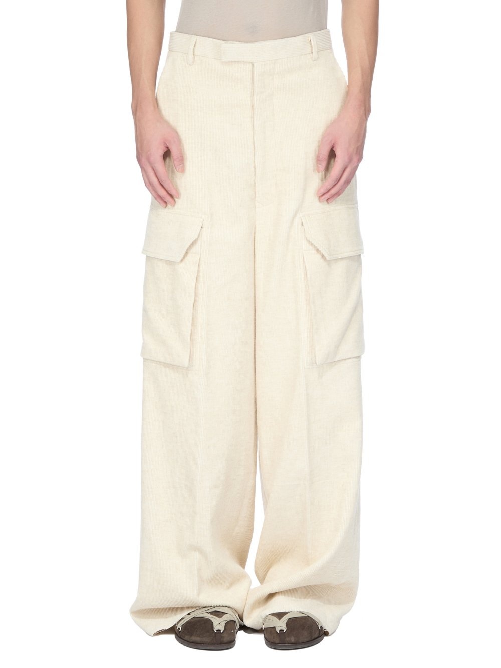 RICK OWENS FW25 CONCORDIANS FIRBANKS IN NATURAL LINEN CORDUROY THESE FIRBANKS ARE A FLOOR LENGTH WITH TWO LARGE LOWER THIGH CARGO POCKETS WITH FLAPS. THEY FEATURE A WAISTBAND WITH CONCEALED FRONT ZIPPER AND BELT LOOPS, SIDE POCKETS AND BACK POCKETS WITH BUTTONS THIS MEDIUMWEIGHT COTTON AND LINEN BLEND CORDUROY HAS A SOFT HANDFEEL THE COLOR OF THIS CORDUROY IS NATURAL WITH SLUBS AND IMPURITIES VISIBLE AS A PART OF THE COLORATION THIS FABRIC IS MADE USING GOTS CERTIFIED ORGANIC COTTON WHICH MEANS THE NATURAL FIBER IS GROWN WITHOUT HARMFUL CHEMICALS, LEAVING OUR SOIL, AIR AND WATER CLEANER FROM CONTAMINATES COLOR: NATURAL MATERIAL: 74% COTTON + 26% LINEN BUTTONS 100% BUFFALO HORN MODEL IS 189CM TALL MODEL WEARS SIZE 48