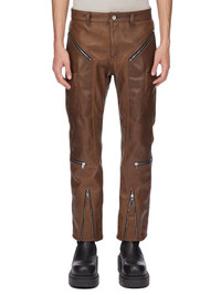 RICK OWENS FW25 CONCORDIANS RUNWAY HEADON JEANS IN BROWN HYBRID HORSE LEATHER THESE HEADON JEANS ARE ANKLE LENGTH AND HAVE A STRAIGHT FIT. THEY HAVE A CONCEALED ZIP FLY WITH TOP BUTTON, SIDE POCKETS, DIAGONAL STROBE ZIPPERED POCKETS, VERTICAL UTILITY POCKETS, AND REAR POCKETS WITH FLAPS. THEY HAVE SIDE KNEE ZIPS THAT CAN BE WORN OPEN AND FRONT SHIN ZIPPERS, ALLOWING THEM ALLOWS TO BE WORN STRAIGHT OR TAPERED THIS HEAVYWEIGHT HORSE LEATHER IS TANNED IN JAPAN. THE TANNING AND DYING METHOD OF THIS LEATHER WILL REVEAL THE BROWN COLOURED UNDERLAYER OF THE HIDE AS THE DARKER OUTER LAYER FADES WITH WEAR AND ABRASION. THE HIDES HAVE BEEN SPECIFICALLY CHOSEN FOR THE NATURAL SCARRING AND MARKINGS OF THE ANIMAL COLOR: BROWN MATERIAL: 100% HORSE LEATHER LINING 50% COTTON + 50% CUPRO MODEL IS 189CM TALL MODEL WEARS SIZE 48