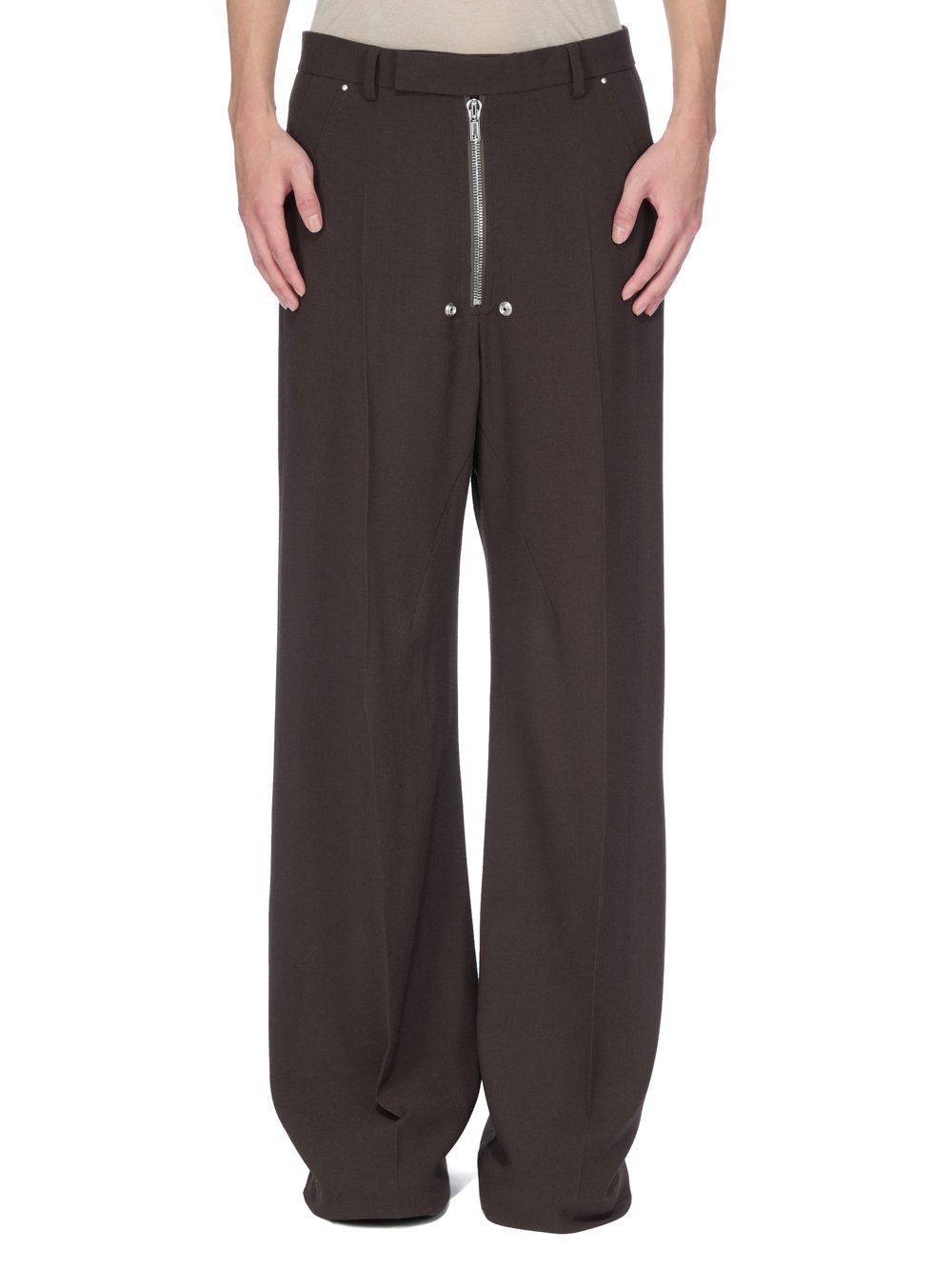 RICK OWENS FW25 CONCORDIANS TAILORED WIDE BELAS IN DARKDUST WOOL SABLE THESE TAILORED WIDE BELAS ARE FULL-LENGTH WITH A LOW CROTCH AND WIDE LEG. THEY FEATURE A WAISTBAND WITH BELT LOOPS, BUTTON CLOSURE AND A BELA EXPOSED CENTER ZIPPER WITH TWO SNAP DETAIL AT BOTTOM. THEY HAVE SIDE WELT POCKETS WITH RIVET AND EYELET DETAIL AND TWO REAR WELT POCKETS WITH SNAPS AND TOPSTITCHING THIS MEDIUMWEIGHT WOOL SABLE FABRIC IS WOVEN WITH HIGH TWIST CREPE YARNS THAT CREATE A DRY HANDFEEL AND TEXTURED SURFACE. IT IS WOVEN IN THE BIELLA REGION OF ITALY RENOWNED FOR ITS LONG TRADITION OF TAILORED WOOL THIS FABRIC IS MADE FROM ZQ CERTIFIED VIRGIN WOOL WHICH ENSURES A HIGH STANDARD IN ANIMAL WELFARE, ENVIRONMENTAL SUSTAINABILITY AND SOCIAL RESPONSIBILITY. EACH BALE OF WOOL IS TRACEABLE BACK TO ITS SOURCE COLOR: DARKDUST MATERIAL: 100% NEW WOOL LINING 100% CUPRO BUTTONS 100% BUFFALO HORN MODEL IS 189CM TALL MODEL WEARS SIZE 48