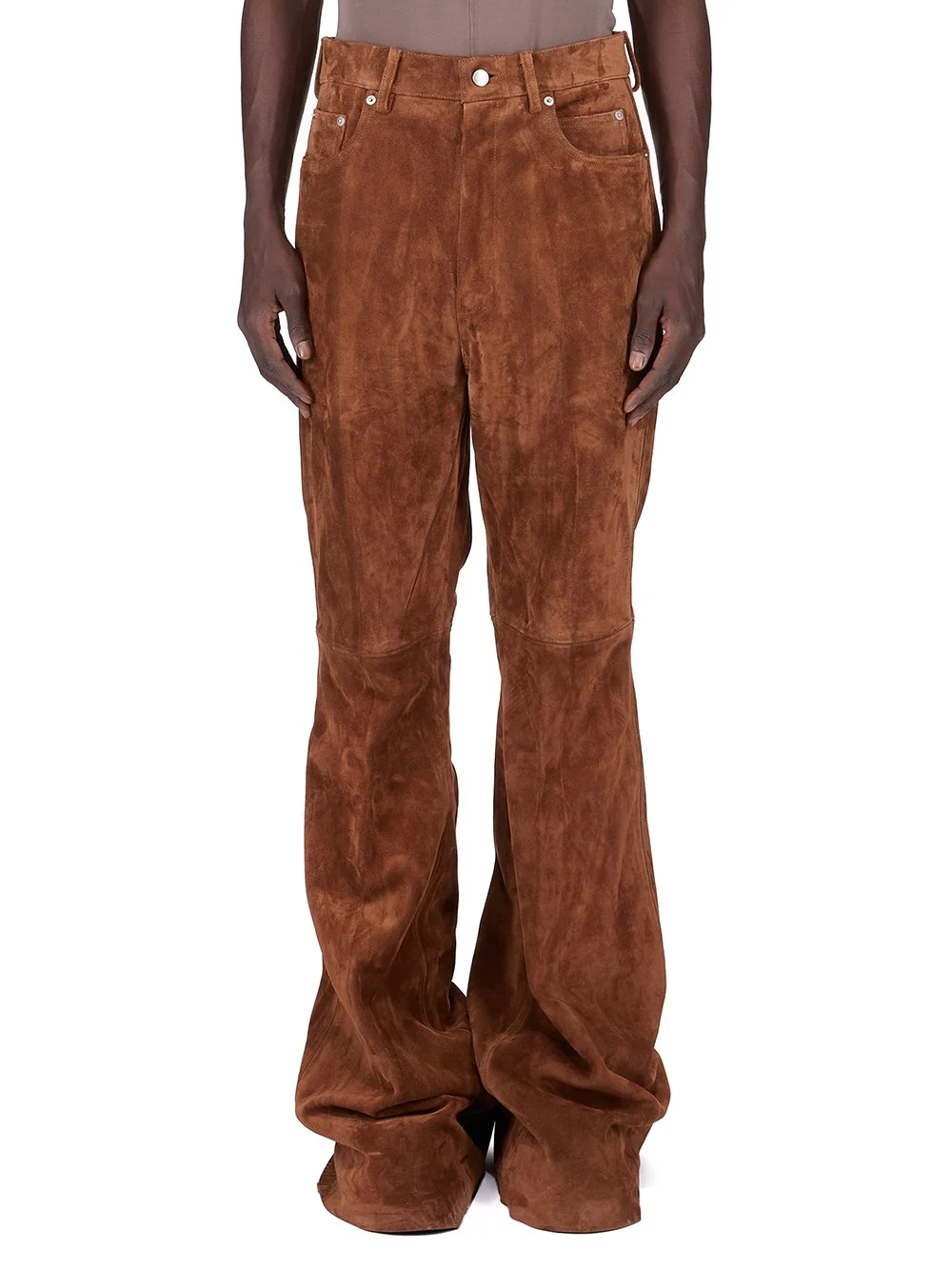 RICK OWENS FW25 CONCORDIANS BOLAN BOOTCUT IN CHESTNUT SUEDE LEATHER THIS BOLAN BOOTCUT IS A HIGH WAISTED, SLIM FIT 6-POCKET JEAN WITH A FLOOR-LENGTH BOOT CUT. THEY HAVE A CONCEALED ZIPPER FLY WITH TOP BUTTON, A WAISTBAND WITH POCKET RIVETS AND REAR PATCH POCKETS WITH TOPSTITCHING THIS MEDIUMWEIGHT CROSTA COW SUEDE LEATHER IS MATTE WITH A HAIRY SURFACE TEXTURE. IT HAS A NATURAL AND WAXY HAND FEEL ACHIEVED BY DRUMMING THE SKINS WITH WAX THIS TANNERY IS LWG CERTIFIED WITH A GOLD RATING COLOR: CHESTNUT MATERIAL: 100% CALF LEATHER LINING 100% COTTON MODEL IS 189CM TALL MODEL WEARS SIZE 31