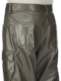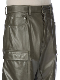 RICK OWENS FW25 CONCORDIANS DOUBLE CARGO JEANS IN BOSCO SUGAR CALF LEATHER THESE DOUBLE CARGO JEANS ARE FULL LENGTH 5 POCKET JEAN WITH A LOW-RISE AND A LOOSE FIT. THEY HAVE A SILVER BUTTON FLY, BELT LOOPS AND POCKET RIVETS AND THEY FEATURE TWO BEVELED CARGO POCKETS ON THE THIGH, WITH TWO SQUARE CARGO POCKETS BELOW, AND TWO SQUARE BACK POCKETS, ALL HAVE FLAPS AND TOPSTITCHING THIS LIGHTWEIGHT CALF LEATHER IS VEG TANNED AND FINISHED USING NATURAL WAXES WHICH GIVES THIS LEATHER ITS GLOSSY, SHINY SURFACE VEG TANNING MEANS ONLY VEGETAL AND NATURAL TANNINS WERE USED IN THE PROCESS OF TANNING AND PRESERVING THIS LEATHER THIS LEATHER IS MADE BY A THIRD GENERATION FAMILY OWNED TANNERY IN THE SOUTH OF ITALY COLOR: BOSCO MATERIAL: 100% CALF LEATHER LINING 100% COTTON MODEL IS 189CM TALL MODEL WEARS SIZE 31