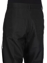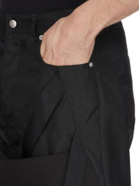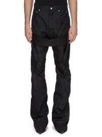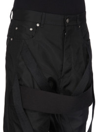 RICK OWENS SS26 TEMPLE MEGASTRAPPED BOLANS IN BLACK NYLON CANVAS THESE MEGASTRAPPED BOLANS ARE A HIGH WAISTED, SLIM FIT 6-POCKET JEAN WITH A FLOOR-LENGTH BOOT CUT. THEY HAVE A CONCEALED ZIPPER FLY WITH TOP BUTTON, A WAISTBAND WITH POCKET RIVETS AND REAR PATCH POCKETS WITH TOPSTITCHING. THIS VERSION FEATURES TWO STRAPS ON EACH THIGH AND ONE WIDE STRAP THAT CONNECTS BOTH THIGHS JUST BELOW THE CROTCH. THIS MEDIUMWEIGHT NYLON CANVAS IS COMPACT WITH A CRISP AND TECHNICAL HANDFEEL. THIS FABRIC IS MADE USING GRS CERTIFIED RECYCLED NYLON WHICH ENSURES A REDUCTION IN WATER CONSUMPTION, EMISSIONS AND HAZARDOUS WASTE, LESSENING THE DEPENDENCE ON NON-RENEWABLE RESOURCES. COLOR: BLACK MATERIAL: 97% NYLON + 3% POLYURETHANE MODEL IS 189CM TALL MODEL WEARS SIZE 31