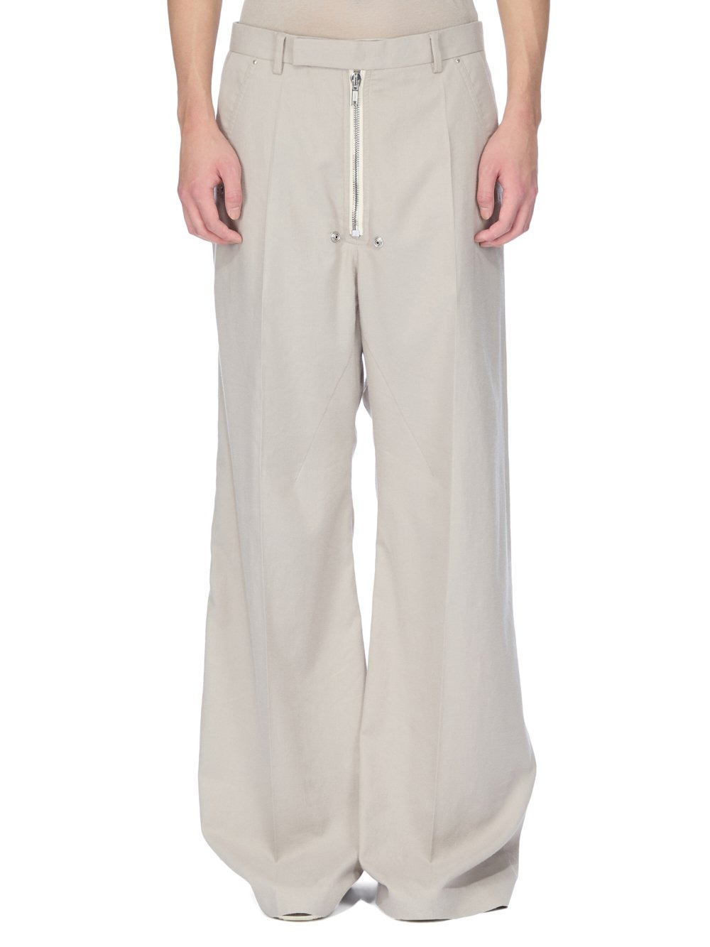 RICK OWENS FW25 CONCORDIANS TAILORED WIDE BELAS IN PEARL WOOL FLANNEL THESE TAILORED WIDE BELAS ARE FULL-LENGTH WITH A LOW CROTCH AND WIDE LEG. THEY FEATURE A WAISTBAND WITH BELT LOOPS, BUTTON CLOSURE AND A BELA EXPOSED CENTER ZIPPER WITH TWO SNAP DETAIL AT BOTTOM. THEY HAVE SIDE WELT POCKETS WITH RIVET AND EYELET DETAIL AND TWO REAR WELT POCKETS WITH SNAPS AND TOPSTITCHING THIS LIGHTWEIGHT WOOL AND COTTON BLEND FLANNEL HAS A SOFT AND BRUSHED HANDFEEL THIS FABRIC IS MADE USING GOTS CERTIFIED ORGANIC COTTON AND RWS CERTIFIED WOOL COLOR: PEARL MATERIAL: 81% COTTON + 19% WOOL LINING 100% CUPRO BUTTONS 100% BUFFALO HORN MODEL IS 189CM TALL MODEL WEARS SIZE 48