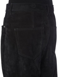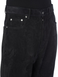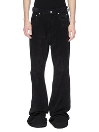 RICK OWENS FW25 CONCORDIANS BOLAN BOOTCUT IN BLACK SUEDE LEATHER THIS BOLAN BOOTCUT IS A HIGH WAISTED, SLIM FIT 6-POCKET JEAN WITH A FLOOR-LENGTH BOOT CUT. THEY HAVE A CONCEALED ZIPPER FLY WITH TOP BUTTON, A WAISTBAND WITH POCKET RIVETS AND REAR PATCH POCKETS WITH TOPSTITCHING THIS MEDIUMWEIGHT CROSTA COW SUEDE LEATHER IS MATTE WITH A HAIRY SURFACE TEXTURE. IT HAS A NATURAL AND WAXY HAND FEEL ACHIEVED BY DRUMMING THE SKINS WITH WAX THIS TANNERY IS LWG CERTIFIED WITH A GOLD RATING COLOR: BLACK MATERIAL: 100% CALF LEATHER LINING 100% COTTON MODEL IS 189CM TALL MODEL WEARS SIZE 31