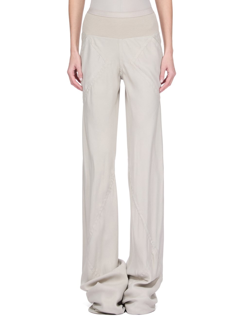 RICK OWENS FW25 CONCORDIANS BIAS IN PEARL WASHED CUPRO THESE BIAS PANTS ARE FLOOR-LENGTH, THEY ARE LOOSE FITTING AND BIAS CUT, WITH DIAGONAL BIAS SEAMS TRACING AROUND THE LEGS. THEY HAVE SQUARE SIDE POCKETS, A ELASTIC AND RIBBING WAISTBAND RAW CUT HEMS THIS MEDIUMWEIGHT WASHED CUPRO SATIN IS FLUID AND FINISHED WITH ENZYMES WHICH GIVES THIS FABRIC ITS PEACH HANDFEEL THIS FABRIC IS MADE USING CUPRO WHICH IS BIODEGRADABLE AND 100% PLANT BASED. AS IT’S MADE FROM COTTON WASTE, CUPRO HELPS FIND A PURPOSE TO FIBERS THAT WOULD OTHERWISE BE DISCARDED COLOR: PEARL MATERIAL: 100% CUPRO BAND 65% COTTON + 35% NYLON MODEL IS 181CM TALL MODEL WEARS SIZE 40