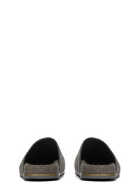 RICK OWENS FW25 CONCORDIANS MULE GRANOLAS IN BOSCO RUGGED WOOL THESE MULE GRANOLAS ARE SLIP ON WITH A COVERED FOOT UP TO THE BRIDGE, AND AN OPEN BACK. THEY HAVE A GRANOLA SCULPTED FOOTBED AND A SHARK-TOOTHED SOLE THIS HEAVYWEIGHT AND RUGGED WOOL MELTON IS COMPACT WITH A DRY HANDFEEL IT IS MADE FROM BRITISH WOOL BLENDED WITH KEMP, ALSO KNOWN AS DEAD HAIR. KEMP FIBERS ARE NATURAL TO SOME SHEEP BREEDS AND DO NOT TAKE DYE COLOR: BOSCO MATERIAL: UPPER 100% WOOL LINING 100% CALF LEATHER PLANTAR FACING 100% CALF LEATHER SOLE 100% COW LEATHER SOLE DETAIL 100% RUBBER