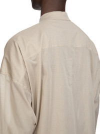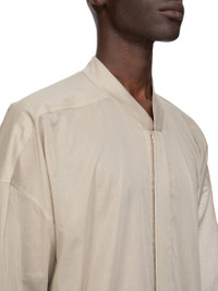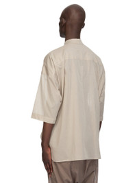 RICK OWENS SS26 TEMPLE SS JUMBO FAUN SHIRT IN PEARL COTTON VOILE THIS SS JUMBO FAUN SHIRT IS HIP LENGTH AND SHORT, ELBOW LENGTH SLEEVES AND HAS AN OVERSIZED BOXY FIT. IT HAS A CENTRE FRONT OPENING WITH CONCEALED SNAP CLOSURES, AND A SLIGHT V NECK WITH FLAT COLLAR. IT FEATURES LEVEL SHOULDER SEAMS, BACK YOKE AND A HEMLINE WITH BEVELED SIDES. THIS LIGHTWEIGHT AND SEMITRANSPARENT COTTON VOILE HAS A SOFT HANDFEEL. THIS FABRIC IS MADE USING GOTS CERTIFIED ORGANIC COTTON WHICH MEANS THE NATURAL FIBRE IS GROWN WITHOUT HARMFUL CHEMICALS, LEAVING OUR SOIL, AIR AND WATER CLEANER FROM CONTAMINATES. COLOR: PEARL MATERIAL:100% COTTON MODEL IS 189CM TALL MODEL WEARS SIZE 48