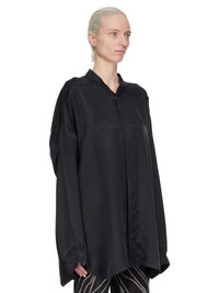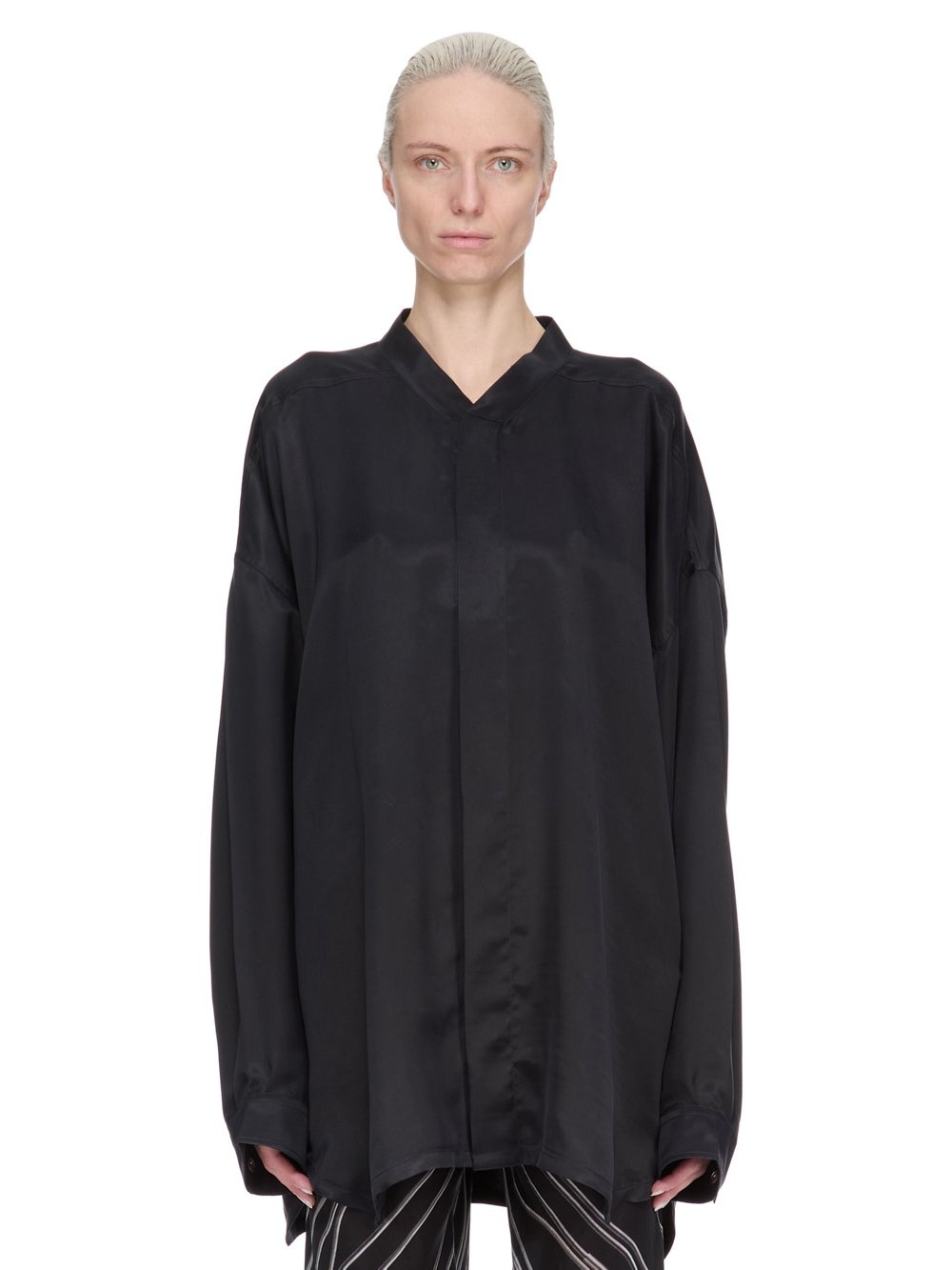 RICK OWENS FW25 CONCORDIANS JUMBO FAUN MINI IN BLACK WASHED CUPRO THIS JUMBO FAUN MINI IS BELOW-HIP LENGTH WITH LONG SLEEVES AND AN OVERSIZED. IT HAS A CENTRE FRONT OPENING WITH CONCEALED SNAP CLOSURES, A SLIGHT V NECK WITH FLAT COLLAR, AND SNAP CUFFS. IT FEATURES LEVEL SHOULDER SEAMS, BACK YOKE AND A HEMLINE WITH BEVELED SIDES THIS MEDIUMWEIGHT WASHED CUPRO SATIN IS FLUID AND FINISHED WITH ENZYMES WHICH GIVES THIS FABRIC ITS PEACH HANDFEEL THIS FABRIC IS MADE USING CUPRO WHICH IS BIODEGRADABLE AND 100% PLANT BASED. AS IT’S MADE FROM COTTON WASTE, CUPRO HELPS FIND A PURPOSE TO FIBERS THAT WOULD OTHERWISE BE DISCARDED COLOR: BLACK MATERIAL: 100% CUPRO MODEL IS 181CM TALL MODEL WEARS SIZE 40