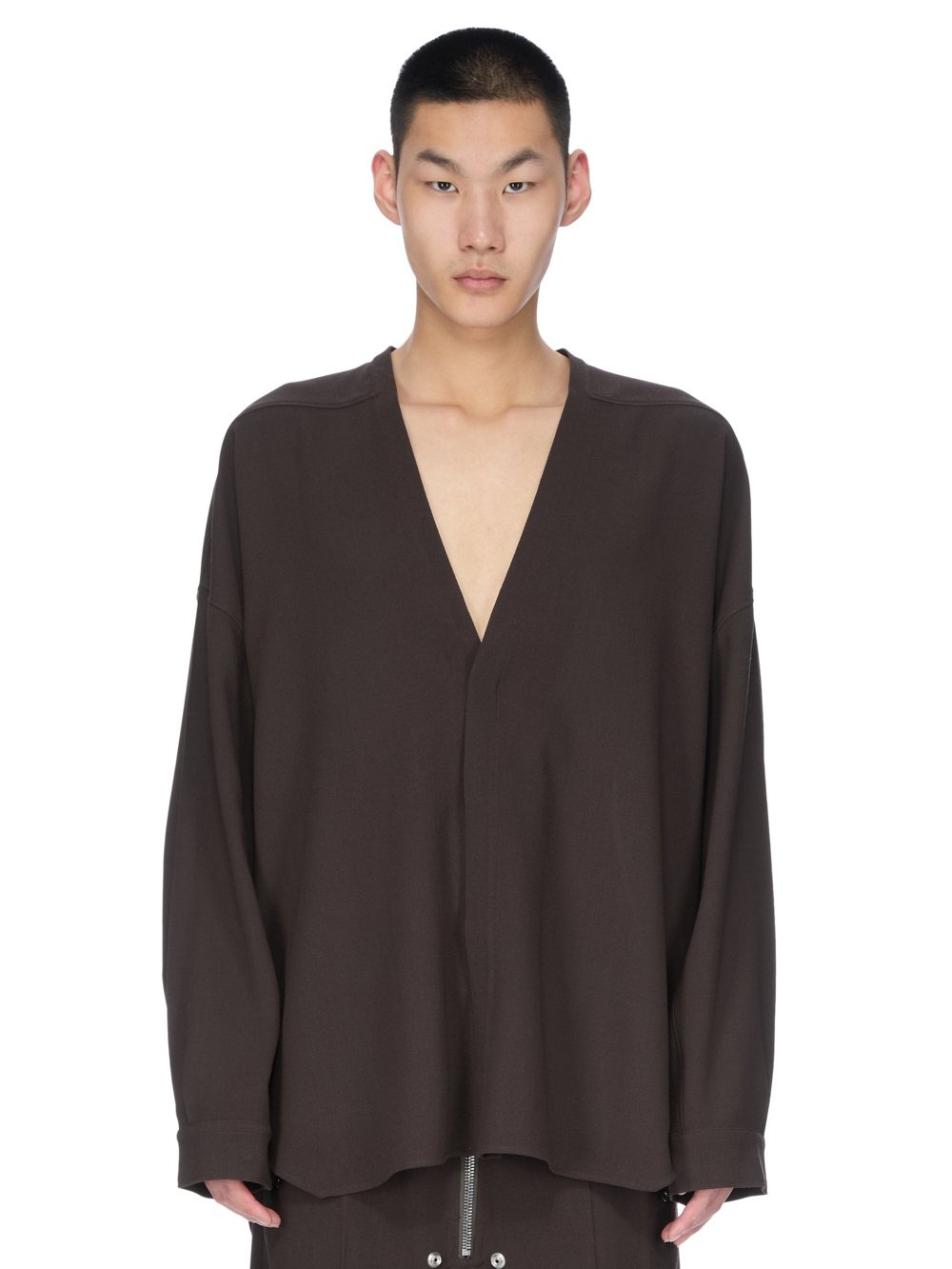 RICK OWENS FW25 CONCORDIANS LIDO LARRY SHIRT IN DARKDUST WOOL SABLE THIS LIDO LARRY SHIRT IS MID THIGH-LENGTH WITH LONG SLEEVES. IT HAS A DEEP V NECK AND CENTRE FRONT OPENING WITH CONCEALED SNAP CLOSURES. IT HAS LEVEL SHOULDER SEAMS, A BACK YOKE AND CUFFS WITH CONCEALED SNAPS THIS MEDIUMWEIGHT WOOL SABLE FABRIC IS WOVEN WITH HIGH TWIST CREPE YARNS THAT CREATE A DRY HANDFEEL AND TEXTURED SURFACE. IT IS WOVEN IN THE BIELLA REGION OF ITALY RENOWNED FOR ITS LONG TRADITION OF TAILORED WOOL THIS FABRIC IS MADE FROM ZQ CERTIFIED VIRGIN WOOL WHICH ENSURES A HIGH STANDARD IN ANIMAL WELFARE, ENVIRONMENTAL SUSTAINABILITY AND SOCIAL RESPONSIBILITY. EACH BALE OF WOOL IS TRACEABLE BACK TO ITS SOURCE COLOR: DARKDUST MATERIAL: 100% NEW WOOL MODEL IS 189CM TALL MODEL WEARS SIZE 48