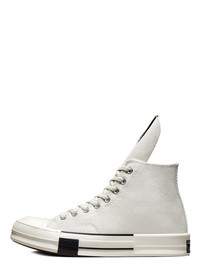 CONVERSE X DRKSHDW DRKSTAR HI IN WHITE. THESE CONVERSE X DRKSHDW DRKSTAR IN WHITE WAXED COTTON TWILL LACED HIGH TOP SHOE BASED ON THE CLASSIC CONVERSE 70’S CHUCKS, FEATURES A SIGNATURE DRKSHDW ELONGATED TONGUE WITH A CUSTOM BRANDED WRAP AROUND WOVEN LABEL BEARING THE MODEL NAME CONTRAST STITCHING AND LACES. SIGNATURE RICK OWENS MOLDED RUBBER HEEL AND MOLDED RUBBER TOE CAP SUPERIMPOSED ONTO THE CLASSIC 70’S CHUCKS RUBBER SOLE CUSTOM MOLDED DRKSHDW LICENSE PLATE WITH PENTAGRAM COLLAB LOGO CONVERSE ALL STAR LOGO ON SIDE WHITE UPPER AND WHITE RUBBER SOLE DELIVERED WITH WHITE LACES AND EXTRA BLACK LACES - COLOR: WHITE - UPPER: 100% COTTON - INSOLE: 100% COTTON - SOLE: 100% RUBBER PLEASE NOTE THE SHOE SIZE LISTED ON THE PRODUCT DESCRIPTION PAGE CORRESPONDS TO USA MEN'S SHOE SIZE WE STRONGLY RECOMMEND OUR CLIENTS TO CHECK THE SIZE CHART BEFORE PLACING AN ORDER TO AVOID ANY POTENTIAL INCONVENIENCE FEEL FREE TO CONTACT CUSTOMERCARE@RICKOWENS.EU FOR ANY ASSISTANCE