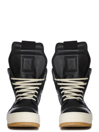 RICK OWENS FW25 CONCORDIANS CREEP GEOBASKET IN BLACK/MILK FULL GRAIN COW LEATHER THESE GEOBASKET ARE ABOVE-ANKLE HEIGHT. THEY FEATURE AN EXTENDED TONGUE WITH WEBBING TAB, SIGNATURE GEOMETRIC PANELS AND A PADDED BACK COUNTER WITH LINES OF TOPSTITCHING. THEY HAVE CONTRAST LACES, A ZIPPER ON THE INSIDE ANKLE FOR EASY FASTENING, AND OUR NATURAL CREEPER SOLE. (HEEL 3,5CM TOE 1CM) THIS MEDIUMWEIGHT FULL GRAIN COW LEATHER HAS A FLAT AND MATTE SURFACE FINISH AND IS SPECIFICALLY TANNED FOR SHOES WITH AN ABRASION-RESISTANT FINISH THIS TANNERY IS LWG CERTIFIED WITH A BRONZE RATING COLOR: BLACK/MILK MATERIAL: UPPER 100% COW LEATHER LINING 100% CALF LEATHER INSOLE 100% CALF LEATHER SOLE 100% THERMOPLASTIC RUBBER SOLE DETAIL 100% RUBBER SOLE HEIGHT 3.5CM LOWER SOLE HEIGHT 1CM