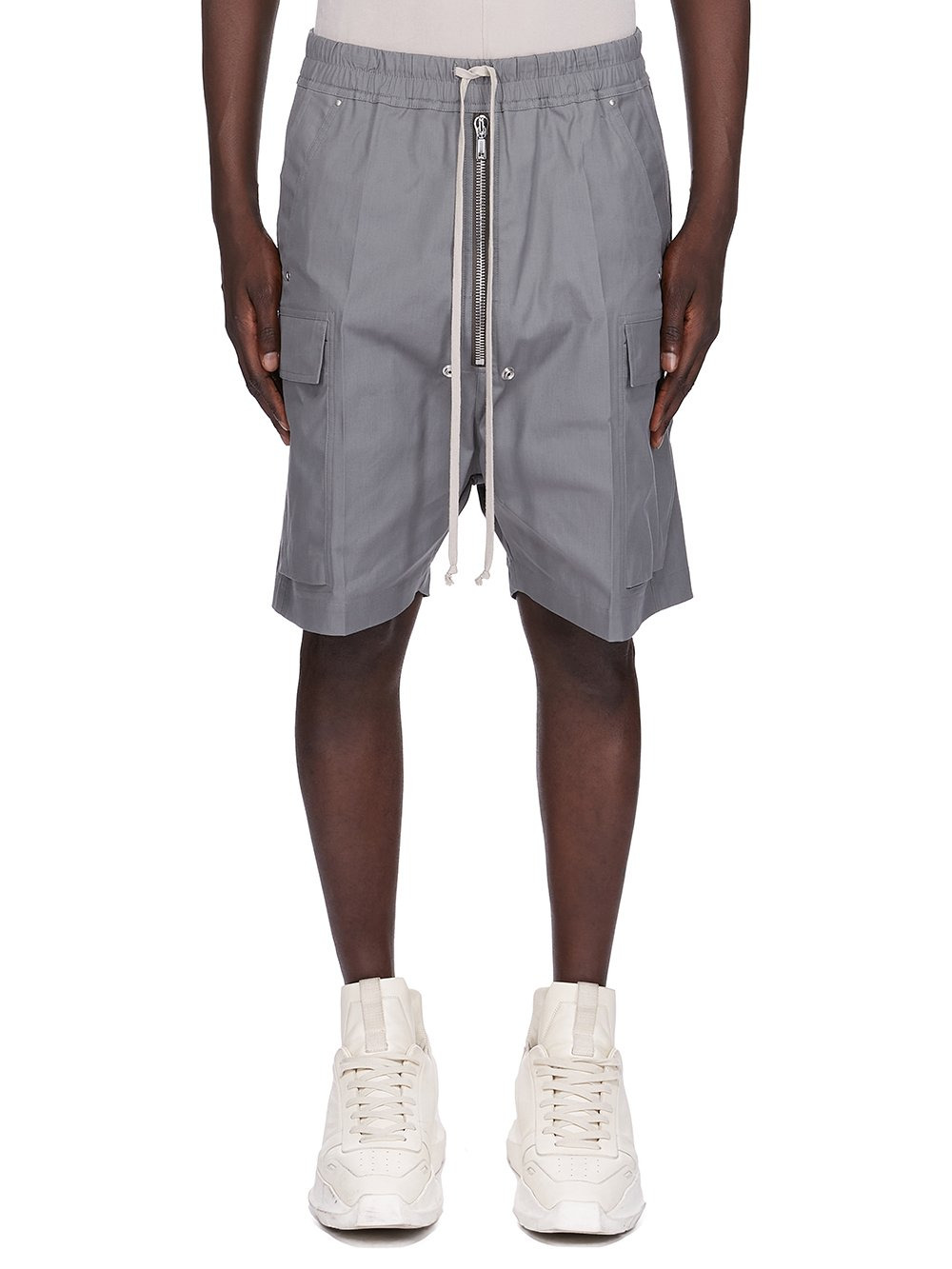 RICK OWENS FW25 CONCORDIANS CARGOBELA SHORTS IN WASHED INDIGO HEAVY COTTON POPLIN THESE CARGOBELA SHORTS ARE KNEE-LENGTH WITH A LOW CROTCH AND WIDE LEG. THEY FEATURE AN ELASTICIZED WAISTBAND WITH DRAWSTRING AND A BELA EXPOSED CENTER ZIPPER WITH TWO SNAP DETAIL AT BOTTOM. THEY FEATURE TWO BEVELED CARGO POCKETS ON THE SIDE LEG WITH TWO REAR WELT POCKETS, ALL WITH CONCEALED SNAPS AND TOPSTITCHING THIS MEDIUMWEIGHT COTTON POPLIN HAS A CRISP HANDFEEL AND WASHED FINISH THIS FABRIC IS MADE USING GOTS CERTIFIED ORGANIC COTTON WHICH MEANS THE NATURAL FIBER IS GROWN WITHOUT HARMFUL CHEMICALS, LEAVING OUR SOIL, AIR AND WATER CLEANER FROM CONTAMINATES COLOR: WASHED INDIGO MATERIAL: 97% COTTON + 3% ELASTANE MODEL IS 189CM TALL MODEL WEARS SIZE 48