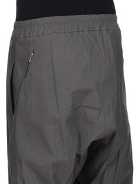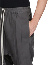 RICK OWENS FOREVER BASKET SWINGERS IN DARKDUST HEAVY COTTON POPLIN THESE BASKET SWINGERS ARE BELOW KNEE LENGTH SHORTS WITH A DROPPED CROTCH. THEY HAVE AN ELASTICIZED WAISTBAND WITH DRAWSTRING, TWO SIDE WELT POCKETS AND TWO SIDE BACK WELT POCKETS WITH ZIPPER CLOSURES. THEY FEATURE A ROUNDED PANEL BETWEEN THE LEGS SIDE SEAM, HEM SLITS, AN INSERTED TRIANGULAR GUSSET, AND TOP STITCHING. THIS MEDIUMWEIGHT COTTON POPLIN HAS A CRISP HANDFEEL AND WASHED FINISH. THIS FABRIC IS MADE USING GOTS CERTIFIED ORGANIC COTTON WHICH MEANS THE NATURAL FIBER IS GROWN WITHOUT HARMFUL CHEMICALS, LEAVING OUR SOIL, AIR AND WATER CLEANER FROM CONTAMINATES. FLAGSHIP STORES AND ONLINE ITEM. COLOR: DARKDUST MATERIAL: 97% COTTON 3% ELASTANE MODEL IS WEARING SIZE 48 MODEL IS 189 CM TALL