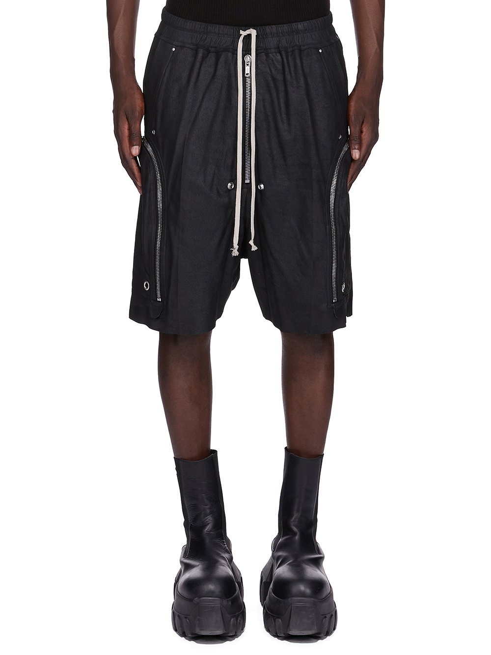 RICK OWENS FW25 CONCORDIANS BAUHAUS BELA IN BLACK BLISTER LAMB LEATHER THESE BAUHAUS BELAS ARE KNEE LENGTH AND FEATURE AN ELASTICIZED WAISTBAND WITH DRAWSTRING. THEY HAVE A BELA EXPOSED CENTRE ZIPPER WITH TWO SNAP DETAIL AT BOTTOM, AND A LOW CROTCH. THEY FEATURE SIDE WELT POCKETS WITH EYELET AND RIVET DETAIL, BAUHAUS ZIPPERED POCKETS WITH LARGE EYELETS, AND BACK POCKETS WITH FLAP AND SNAP CLOSURES THIS LIGHTWEIGHT LAMB LEATHER HAS AN EXAGGERATED, UNEVEN BLISTERED TEXTURE AND A SOFT, FLUID HANDFEEL. THE BLISTERED TEXTURE IS ACHIEVED BY EXAGGERATING THE NATURAL GRAIN TEXTURE OF EACH SKIN, THEREFORE THE LOOK OF EACH SKIN IS UNIQUE THIS LEATHER IS MADE BY A THIRD GENERATION FAMILY OWNED TANNERY IN THE SOUTH OF ITALY COLOR: BLACK MATERIAL: 100% LAMB LEATHER POCKETS TONGUE 100% COW LEATHER LINING 100% COTTON MODEL IS 189CM TALL MODEL WEARS SIZE 48