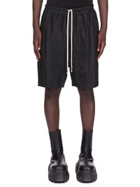 RICK OWENS FW25 CONCORDIANS BOXERS IN BLACK BLISTER LAMB LEATHER THESE BOXERS ARE KNEE LENGTH. THEY HAVE AN ELASTICIZED WAIST, A SLIGHTLY DROPPED CROTCH, SIDE WELT POCKETS AND BEVELED SIDE SPLITS THIS LIGHTWEIGHT LAMB LEATHER HAS AN EXAGGERATED, UNEVEN BLISTERED TEXTURE AND A SOFT, FLUID HANDFEEL. THE BLISTERED TEXTURE IS ACHIEVED BY EXAGGERATING THE NATURAL GRAIN TEXTURE OF EACH SKIN, THEREFORE THE LOOK OF EACH SKIN IS UNIQUE THIS LEATHER IS MADE BY A THIRD GENERATION FAMILY OWNED TANNERY IN THE SOUTH OF ITALY COLOR: BLACK MATERIAL: 100% LAMB LEATHER LINING 94% CUPRO + 6% ELASTANE BUTTONS 100% BUFFALO HORN MODEL IS 189CM TALL MODEL WEARS SIZE 48