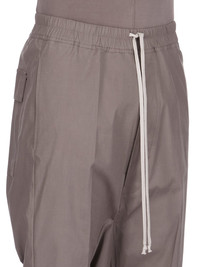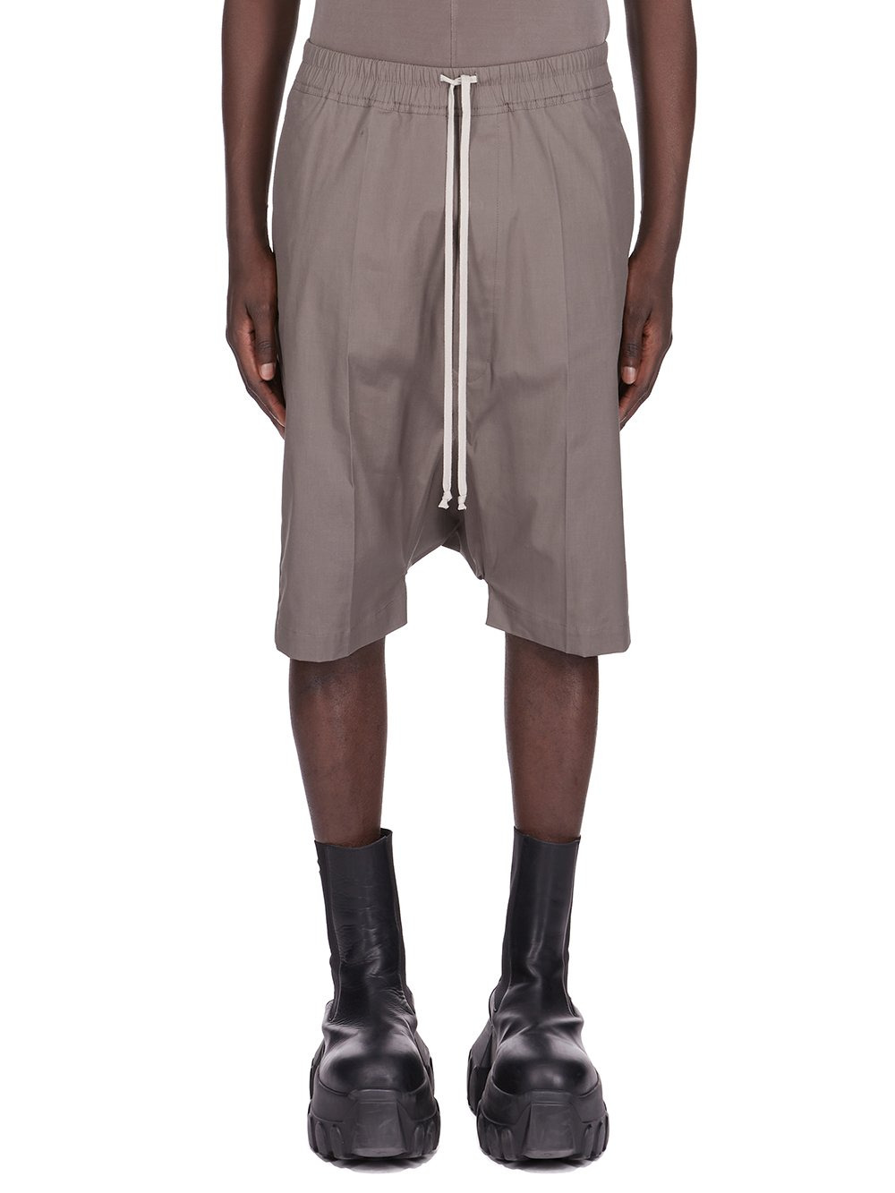 RICK OWENS FW25 CONCORDIANS RICKS PODS IN DUST HEAVY COTTON POPLIN THESE BELA PODS ARE BELOW KNEE LENGTH SHORTS WITH A LOW DROPPED CROTCH. THEY HAVE AN ELASTICIZED WAISTBAND WITH DRAWSTRING, A BELA EXPOSED CENTER ZIP WITH TWO SNAP DETAIL AT BOTTOM, TWO SIDE WELT POCKETS WITH EYELETS AND TWO SQUARE BACK POCKETS WITH FLAPS AND SNAPS THIS MEDIUMWEIGHT COTTON POPLIN HAS A CRISP HANDFEEL AND WASHED FINISH THIS FABRIC IS MADE USING GOTS CERTIFIED ORGANIC COTTON WHICH MEANS THE NATURAL FIBER IS GROWN WITHOUT HARMFUL CHEMICALS, LEAVING OUR SOIL, AIR AND WATER CLEANER FROM CONTAMINATES COLOR: DUST MATERIAL: 97% COTTON 3% ELASTANE MODEL IS 189CM TALL MODEL WEARS SIZE 48