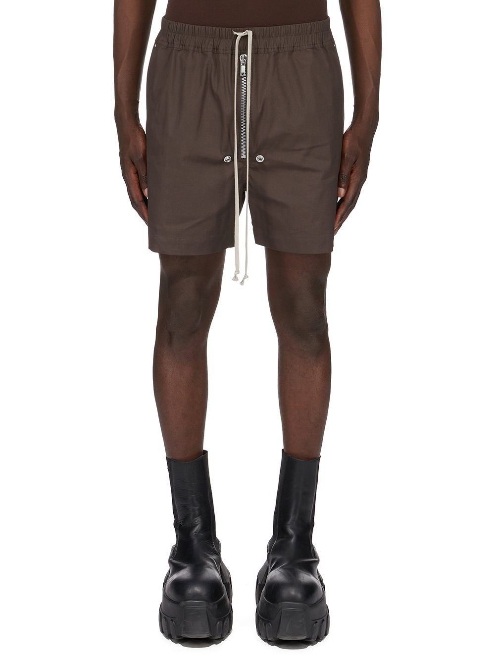RICK OWENS FW25 CONCORDIANS BELA BOXERS IN DARKDUST HEAVY COTTON POPLIN THESE BELA BOXERS ARE ABOVE KNEE LENGTH WITH A LOOSE FIT. THEY HAVE AN ELASTICIZED WAISTBAND WITH DRAWSTRING, A BELA EXPOSED CENTRE ZIPPER WITH TWO SNAP DETAIL AT BOTTOM, SIDE POCKETS WITH EYELET AND RIVET DETAIL, AND SPLITS IN THE HEM AT THE SIDE SEAMS THIS MEDIUMWEIGHT COTTON POPLIN HAS A CRISP HANDFEEL AND WASHED FINISH THIS FABRIC IS MADE USING GOTS CERTIFIED ORGANIC COTTON WHICH MEANS THE NATURAL FIBER IS GROWN WITHOUT HARMFUL CHEMICALS, LEAVING OUR SOIL, AIR AND WATER CLEANER FROM CONTAMINATES COLOR: DARKDUST MATERIAL: 97% COTTON + 3% ELASTANE MODEL IS 189CM TALL MODEL WEARS SIZE 48