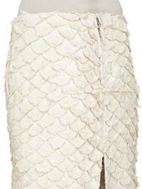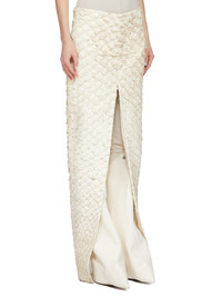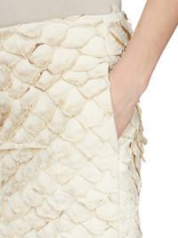 RICK OWENS FW25 CONCORDIANS RUNWAY SLICED SKIRT IN NATURAL WAXY PIRARUCU THIS SLICED SKIRT IS FLOOR LENGTH AT SIDES. IT HAS A CENTRE BACK ZIPPER AND A CLOSE TO THE BODY FIT. IT FEATURES TWO HIGH SLITS FRONT AND BACK AS WELL AS A FRONT AND BACK STITCH RIDGE DETAIL. IT HAS SIDE SEAM POCKETS. THIS GENUINE PIRARUCU FISHSKIN HAS A SOFT, MATTE AND WAXY FINISH THE PIRARUCU IS ONE OF THE WORLD’S LARGEST FRESHWATER FISH. NATIVE TO THE AMAZON BIOME, IT IS TRADITIONALLY FISHED AS A FOOD SOURCE BY LOCAL COMMUNITIES AND THE SKIN IS WASTED. THE LEGAL CAPTURE OF PIRARUCU IS TODAY RESTRICTED TO SPECIFIC ECOLOGICAL RESERVES AND LIMITED IN ORDER TO PRESERVE THE SPECIES. BY RECYCLING THE GIANT SKINS, INDIGENOUS COMMUNITIES IN BRAZIL ARE ABLE TO RECEIVE A SIGNIFICANT INCOME FROM SOMETHING THAT WAS NORMALLY DISCARDED. TAKING CARE OF THIS BY-PRODUCT ALSO PROVIDES JOB OPPURTUNITIES FOR THE SAME COMMUNITIES AND FINANCES PART OF THE BIODIVERSITY PRESERVATION COLOR, MARKINGS AND SCALE TEXTURE ARE NATURAL TO THE ANIMAL, THEREFORE THERE WILL BE VARIATIONS IN COLOR AND PATTERN MAKING EACH SKIN AND PRODUCT UNIQUE PIRARUCU IS PROTECTED BY THE CITIES AGREEMENT AND REGULATIONS, WHICH MEANS EACH SKIN CAN BE TRACED BACK TO ITS ORIGIN FLAGSHIP STORES AND ONLINE EXCLUSIVE ITEM COLOR: NATURAL MATERIAL: 100% LEATHER OF PIRARUCU FISH MODEL IS 181CM TALL MODEL WEARS SIZE 38