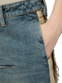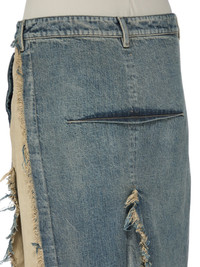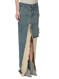 RICK OWENS FW25 CONCORDIANS RUNWAY DENIM SLICED SKIRT IN DIRTY HUSTLER/NATURAL 14OZ HUSTLER SLUB DENIM AND COTTON TELA THIS DENIM SLICED SKIRT IS FLOOR LENGTH AT SIDES. IT HAS A SHORT CENTRE FRONT ZIPPER, AND BUTTON CLOSURE AND A CLOSE TO THE BODY FIT. IT FEATURES TWO HIGH SLITS FRONT AND BACK WITH RAW CUT EDGES, AS WELL AS A FRONT AND BACK RIDGE STITCH DETAIL. IT HAS SIDE SEAM POCKETS. THIS IS A COLLAGE VERSION THIS IS A COMBINATION OF 14OZ HUSTLER SLUB DENIM AND COTTON TELA THIS MEDIUMWEIGHT HUSTLER DENIM IS MADE ON A 14OZ JAPANESE INDIGO AND NATURAL SLUB DENIM WOVEN IN FUKUYAMA PREFECTURE BY A MILL FOUNDED IN 1893. THE READY GARMENT IS STONE WASHED WITH MINERAL DYES TO ACHIEVE THE HUSTLER WASH THIS FABRIC IS MADE USING GOTS CERTIFIED ORGANIC COTTON WHICH MEANS THE NATURAL FIBER IS GROWN WITHOUT HARMFUL CHEMICALS, LEAVING OUR SOIL, AIR AND WATER CLEANER FROM CONTAMINATES THIS GARMENT IS TREATED IN AN ITALIAN WASH HOUSE BASED IN THE VENETO AREA OF ITALY, THAT PRODUCES IN SMALLER TREATMENT BATHS TO REDUCE WATER WASTE AND UTILIZE A WATER PURIFYING PROCESS THAT ENABLES THEM TO RECYCLE A PORTION OF THE WATER USED. ALL OF OUR DENIM WASHES ARE ZDHC CERTIFIED COLOR: DIRTY HUSTLER/NATURAL MATERIAL: 100% COTTON DETAILS 100% COTTON POCKETS LINING 52% POLYESTER + 48% COTTONMODEL IS 181CM TALL MODEL WEARS SIZE 40