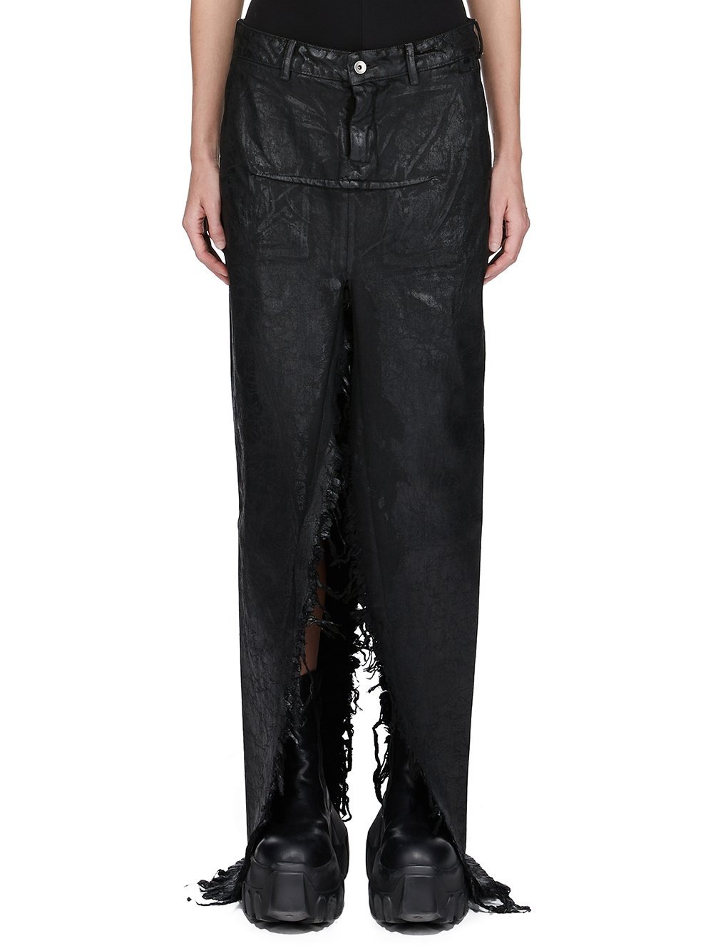 RICK OWENS FW25 CONCORDIANS RUNWAY DENIM SLICED SKIRT IN BLACK 13OZ BLACK MEGACRUST THIS DENIM SLICED SKIRT IS FLOOR LENGTH AT SIDES. IT HAS A SHORT CENTRE FRONT ZIPPER, AND BUTTON CLOSURE AND A CLOSE TO THE BODY FIT. IT FEATURES TWO HIGH SLITS FRONT AND BACK WITH RAW CUT EDGES, AS WELL AS A FRONT AND BACK RIDGE STITCH DETAIL. IT HAS SIDE SEAM POCKETS THIS MEDIUMWEIGHT MEGACRUST DENIM IS MADE ON A 13OZ BLACK AND NATURAL JAPANESE DENIM. THE READY GARMENT IS OVERDYED BLACK AND TREATED WITH A WAX FINISH, THEN SEVERAL LAYERS OF BLACK FOIL IS PRESSED ON TOP AND A FINAL WASH MAKES THE FOIL PEEL AND CRACK THE NATURAL ASPECTS OF THIS TREATMENT MEANS THE FOIL HAS PEELED OFF AND CRACKED IN CERTAIN AREAS AND WILL CONTINUE TO DO SO WITH WEAR AND ABRASION. THIS IS AN INHERENT CHARACTERISTIC OF THIS TYPE OF TREATMENT AND IS A DESIRED A VISUAL ASPECT WHICH ADDS TO THE UNIQUENESS OF EACH PIECE THIS GARMENT IS TREATED IN AN ITALIAN WASH HOUSE BASED IN THE VENETO AREA OF ITALY, THAT PRODUCES IN SMALLER TREATMENT BATHS TO REDUCE WATER WASTE AND UTILIZE A WATER PURIFYING PROCESS THAT ENABLES THEM TO RECYCLE A PORTION OF THE WATER USED. ALL OF OUR DENIM WASHES ARE ZDHC CERTIFIED COLOR: BLACK MATERIAL: 100% COTTON POCKETS LINING 52% POLYESTER + 48% COTTON MODEL IS 181CM TALL MODEL WEARS SIZE 40